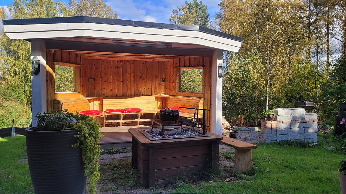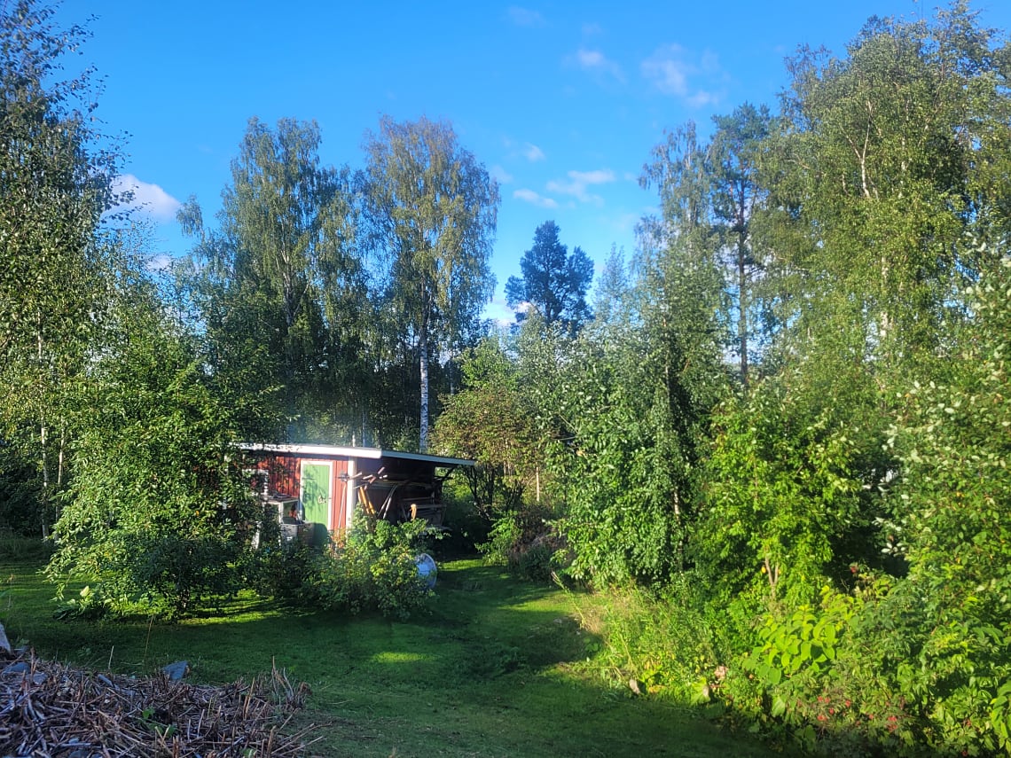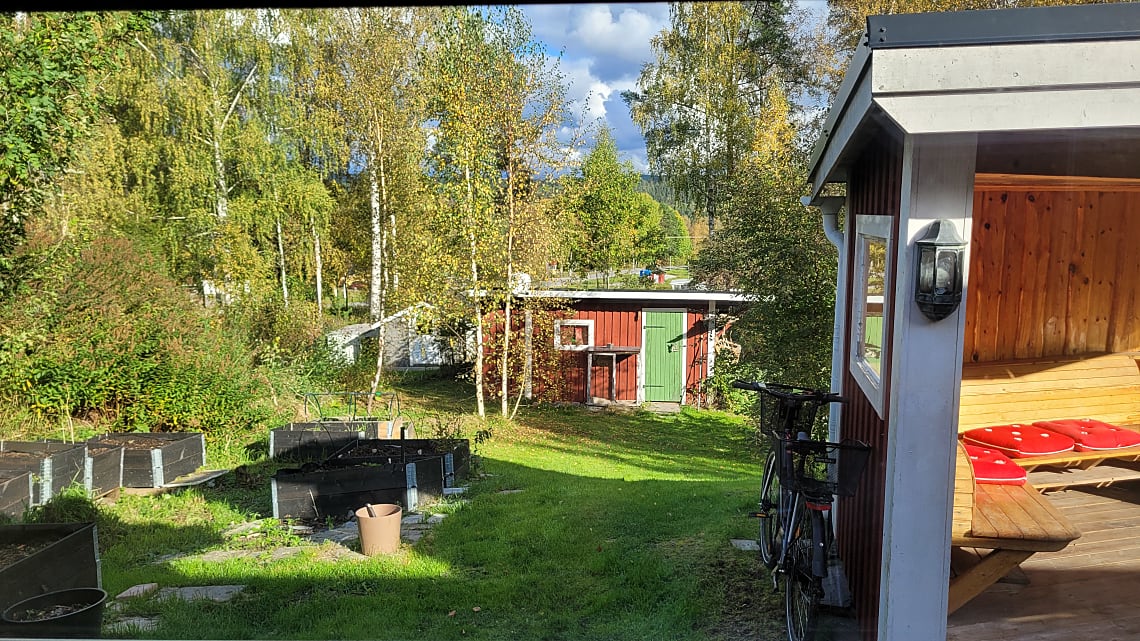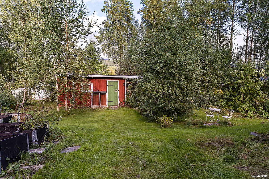 Tomten är grönskande och full av blomster, här finns välgödslade pallkragar för den odlingsintresserade och bärbuskar samt ett fläderträd. En grillhytta med elbelysning och infravärme, är en perfekt plats för sena sommarkvällar med vänner och familj.