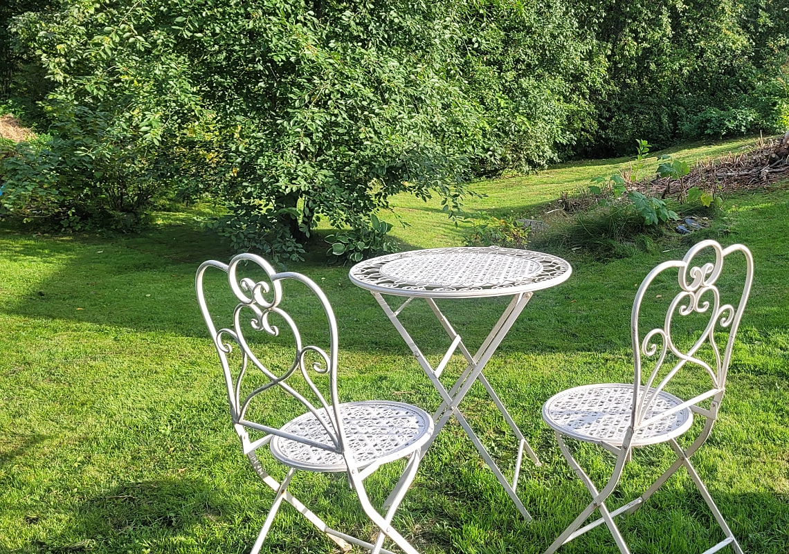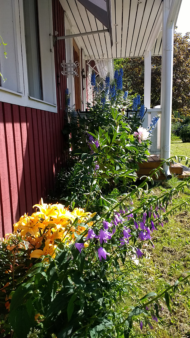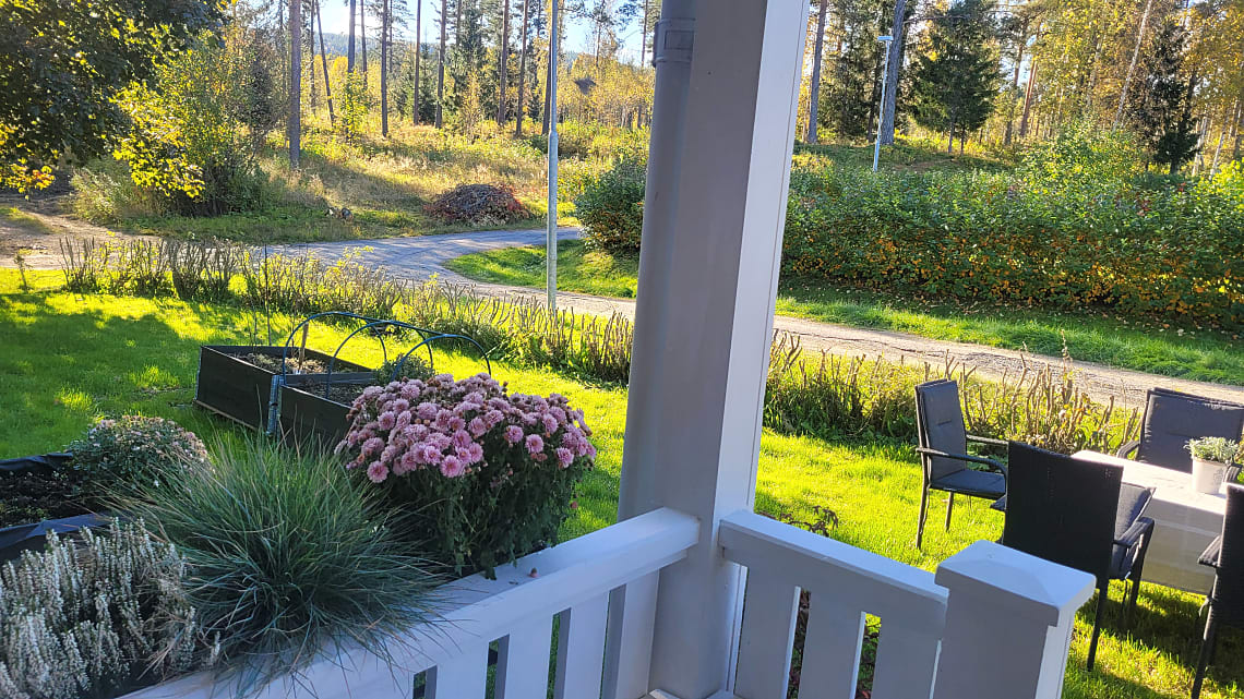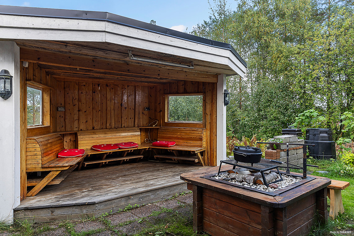 Tomten är grönskande och full av blomster, här finns välgödslade pallkragar för den odlingsintresserade och bärbuskar samt ett fläderträd. En grillhytta med elbelysning och infravärme, är en perfekt plats för sena sommarkvällar med vänner och familj.