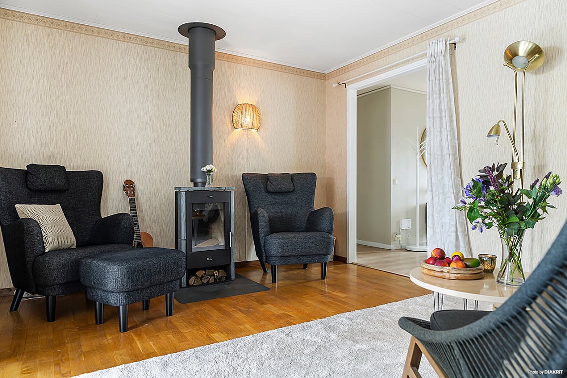 Rymligt vardagsrum med kamin som skapar värme och trivsel under årets kalla dagar. Direkt utgång till den soliga altanen gör rummet till en naturlig samlingsplats för både avkoppling och umgänge.