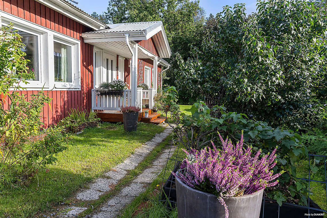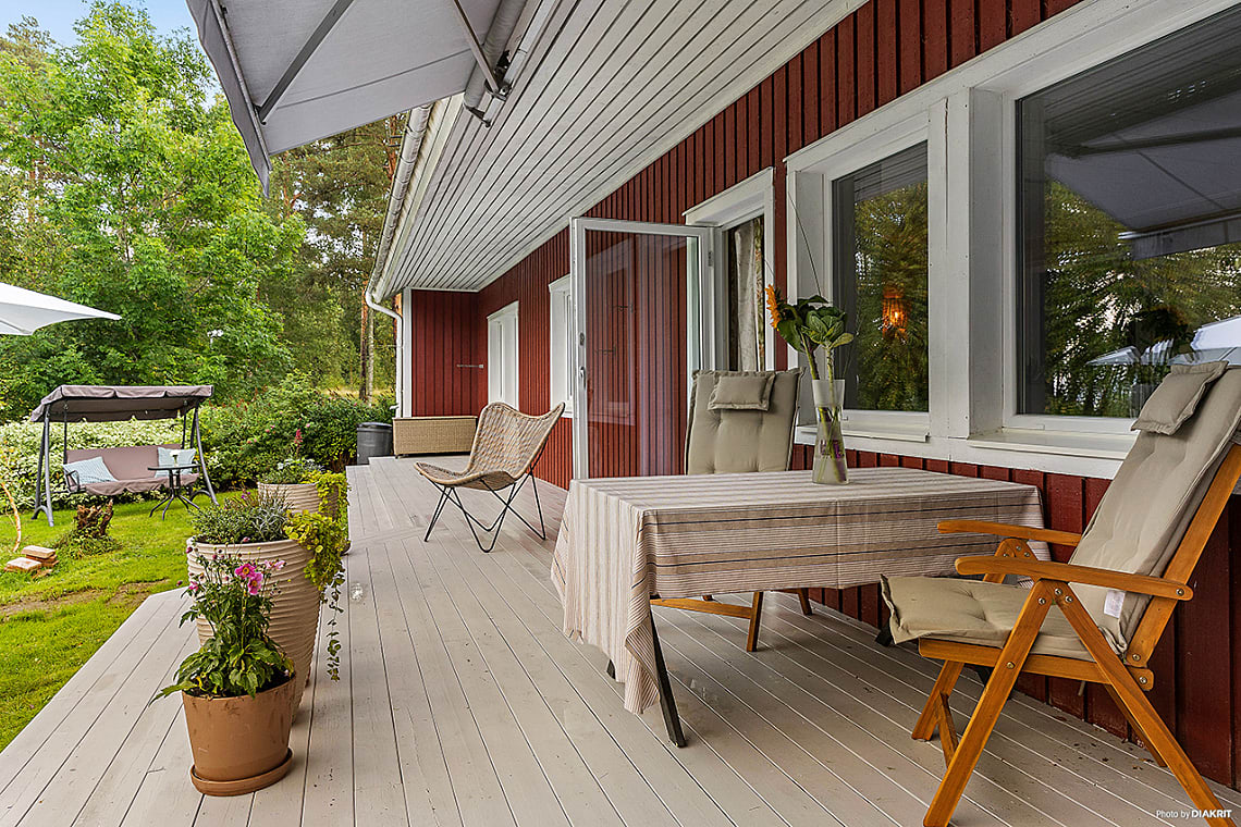 Huset erbjuder hela fyra sovrum, ett generöst allrum med kamin och direkt utgång till den soliga altanen som sträcker sig längs husets långsida, en given plats för umgänge och avkoppling under sommarhalvåret. Köket är stort och funktionellt med gott om plats för matlagning och gemenskap, och intill finns en praktisk tvättstuga. Badrummet är stilfullt renoverat med moderna materialval som ger en känsla av vardagslyx.