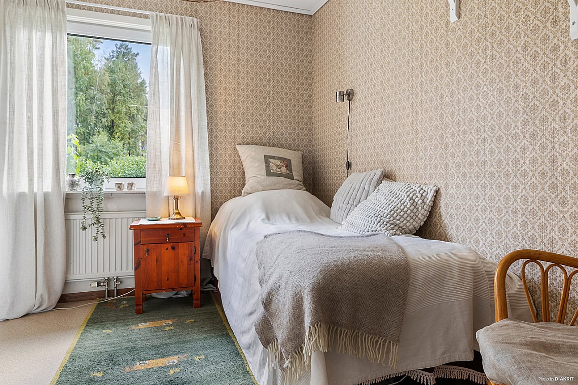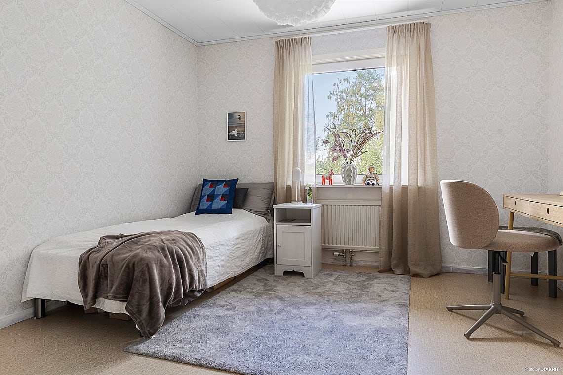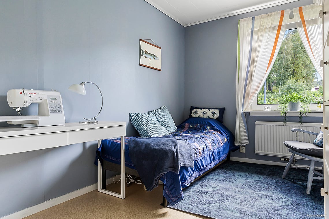 Här finns plats för säng och tillhörande möbler samt skrivbord. Garderob för förvaring.