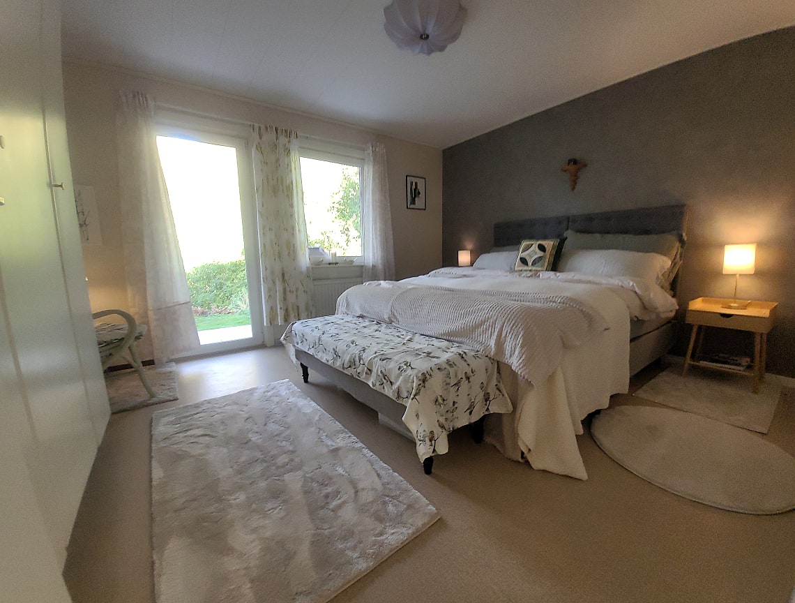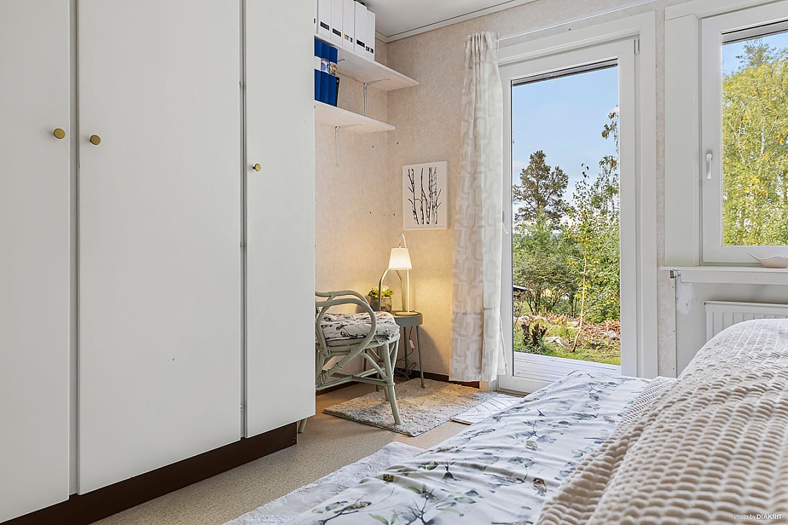 Rymligt sovrum med plats för dubbelsäng och tillhörande möbler. Garderob för förvaring. Stort fönsterparti ger rummet ett naturligt ljusinsläpp. Utgång till altan.