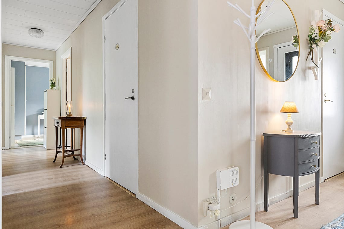 Välkomnande och ljus hall med plats för avhängning av ytterkläder och skor.