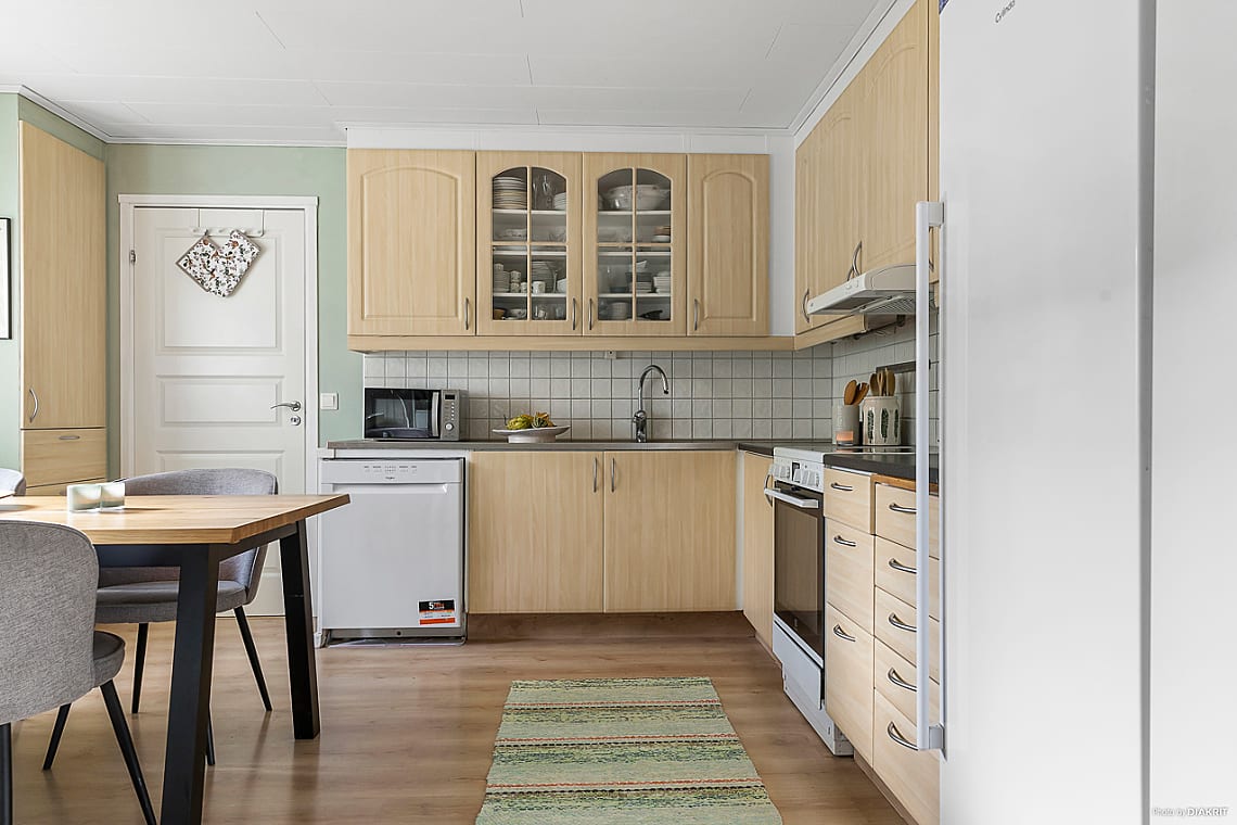 Köket är utrustat med kombinerad ugn med spishäll, fläkt, diskmaskin samt kyl och frys.