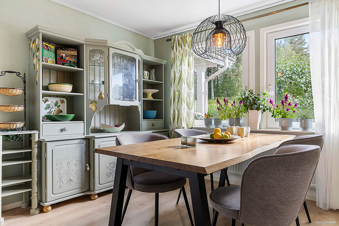 Rymligt kök med plats för ett större matbord intill fönstret, vilket ger en trivsam plats för måltider med utsikt över trädgården. Goda arbetsytor och generös förvaring gör köket både funktionellt och praktiskt.