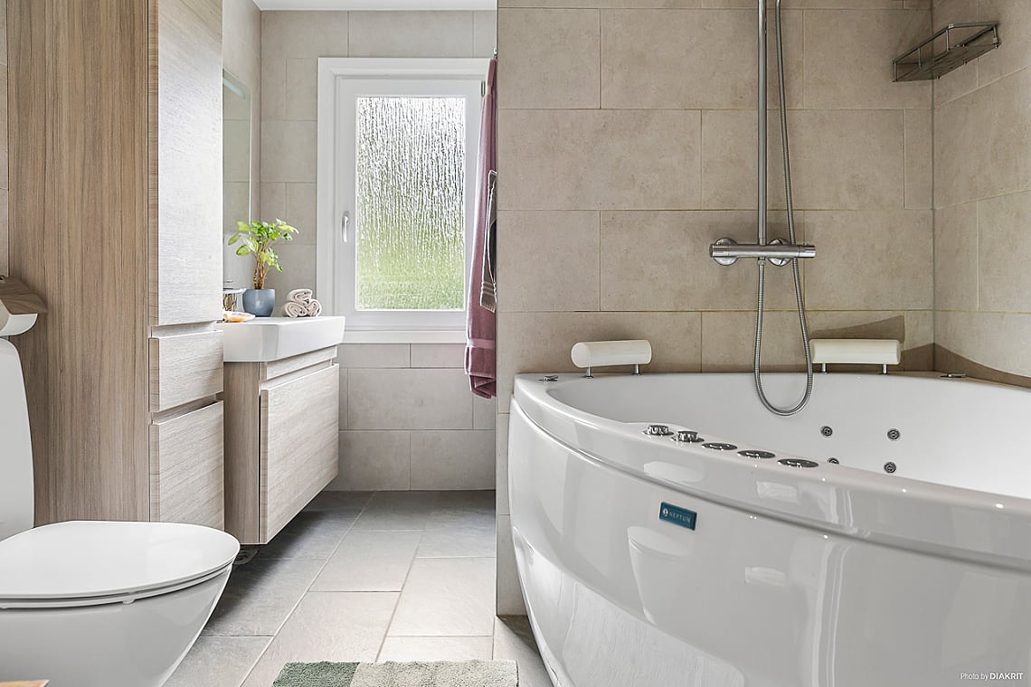 Helkaklat badrum med golvvärme. Här finns handfat i kommod, WC samt dusch och badkar.