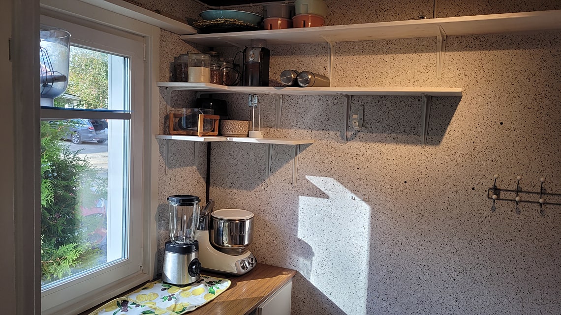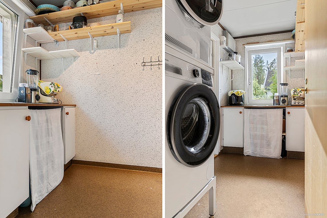 Tvättmaskin och torktumlare. Torkrum samt gott om arbetsyta.