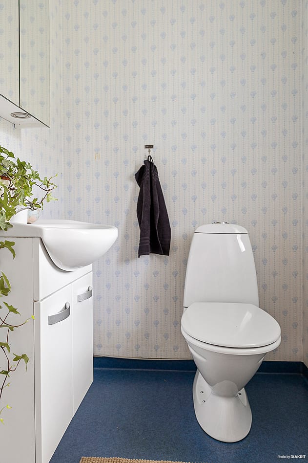 Utrymme med handfat i kommod, spegelskåp och WC. Plastmatta på golv och väggar.