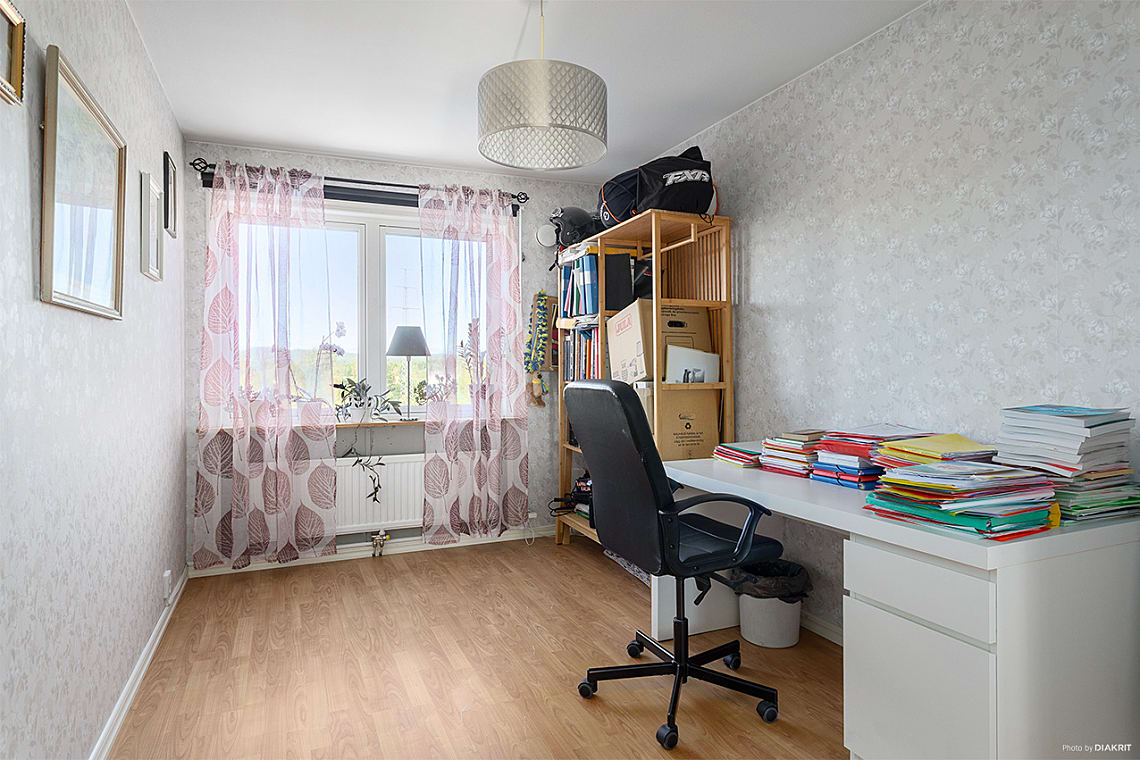 Laminatgolv och två fönster som skänker gott om ljus in i rummet.