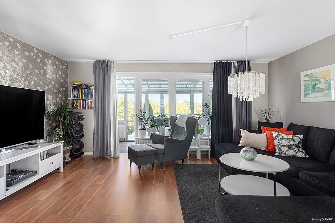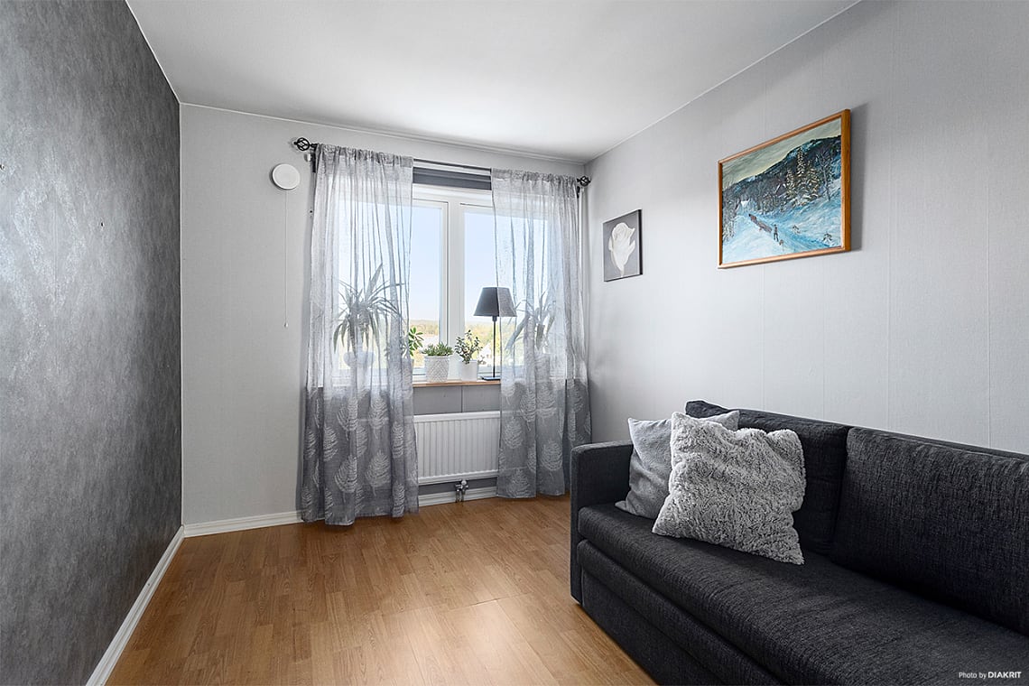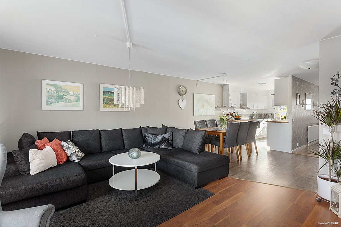 Gott om plats för soffgrupp med tillhörande möblemang. Laminatgolv och tapetserade väggar.