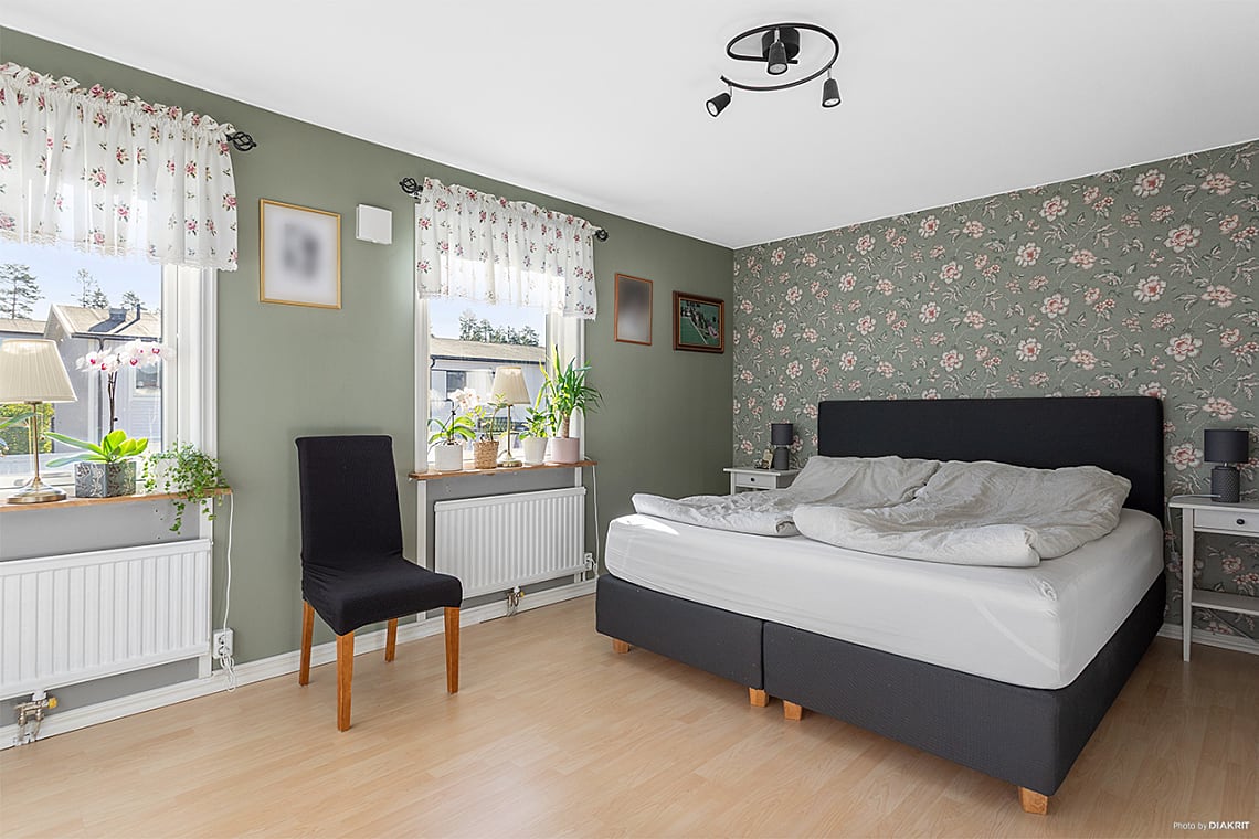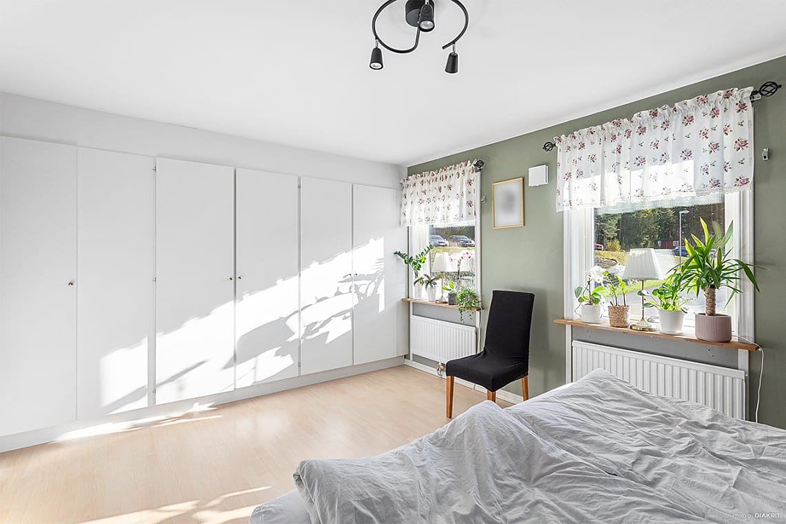 Stort sovrum med gott om plats för dubbelsäng och övrigt möblemang. Goda förvaringsmöjligheter i inbyggda garderober.