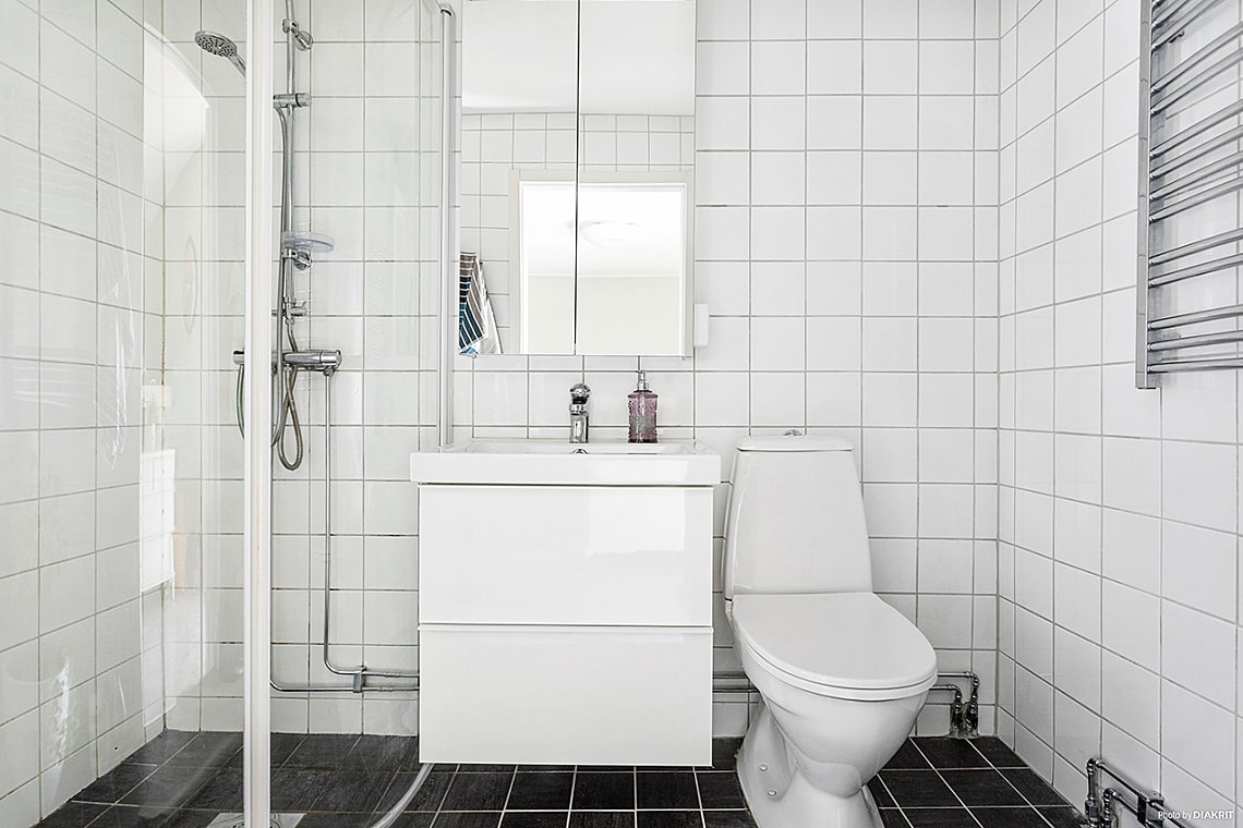 Helkaklat badrum i stilrena färger. WC, handfat med kommod, spegelskåp, handduksvärmare samt dusch med vikbara glasväggar.