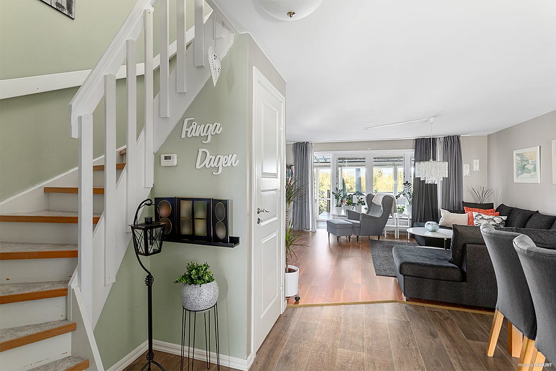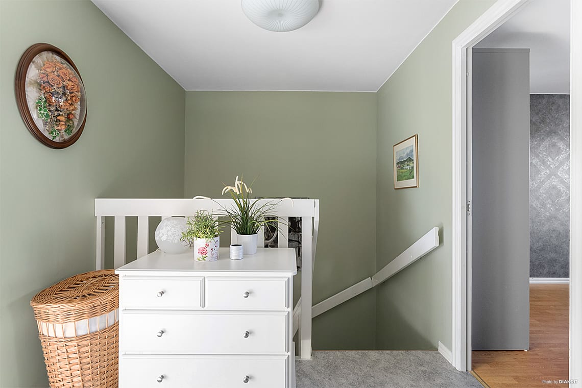 Upp för trappan når man en mindre hall med målade väggar i grön nyans och ser leder en vidare till bostadens tre sovrum.