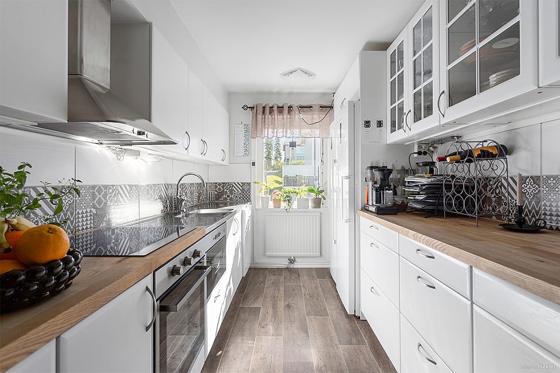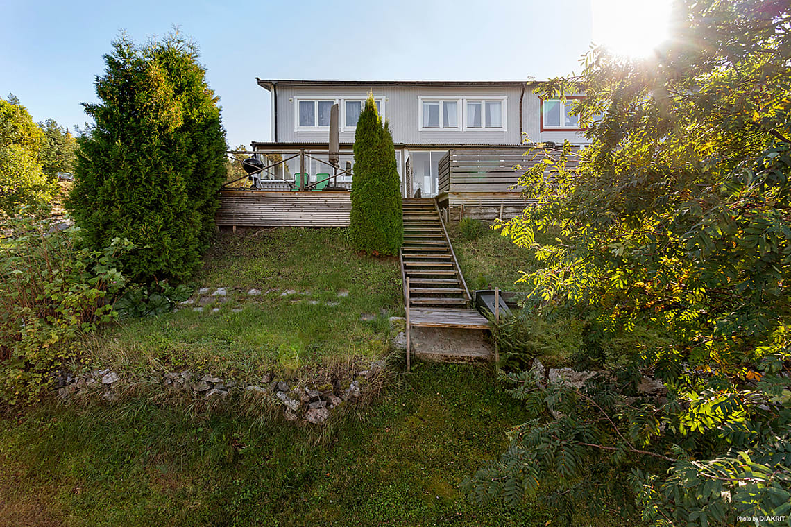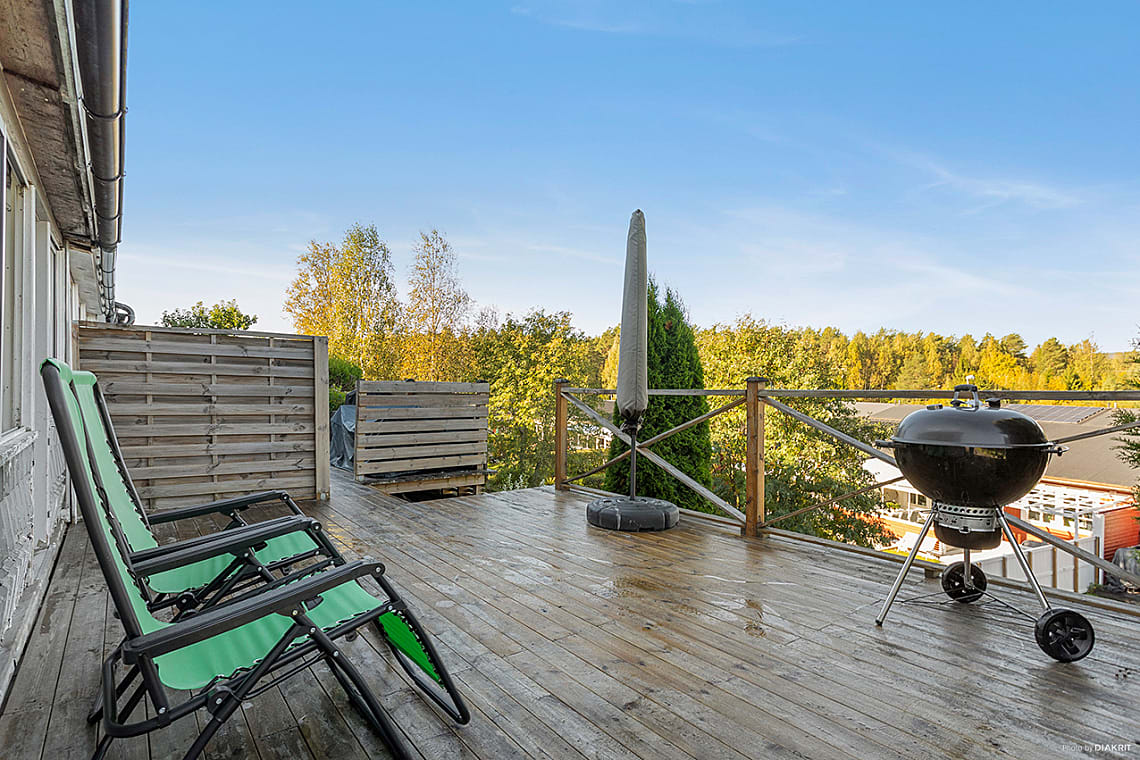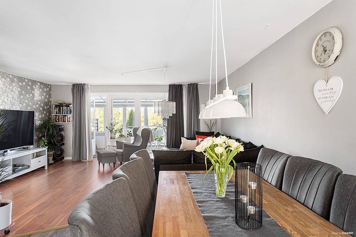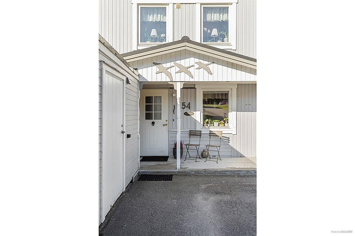 Välkommen till detta trivsamma och funktionella gavelradhus med bra planlösning! Entréplanet erbjuder en praktisk hall med klädhängare och skohylla, gästtoalett samt ett separat tvättrum med både tvättmaskin och torktumlare. Det ljusa köket har goda arbetsytor och plats för matbord, och i anslutning ligger ett rymligt vardagsrum med utgång till en inglasad uteplats som leder vidare till en generös altan med härlig kvällssol– perfekt för umgänge och avkoppling. På övre plan finns ett stilrent, helkaklat badrum i svart och vitt samt tre sovrum, varav ett större med gott om förvaring i inbyggda garderober. Ett hem att leva i – från morgonkaffe till middagsbjudning.