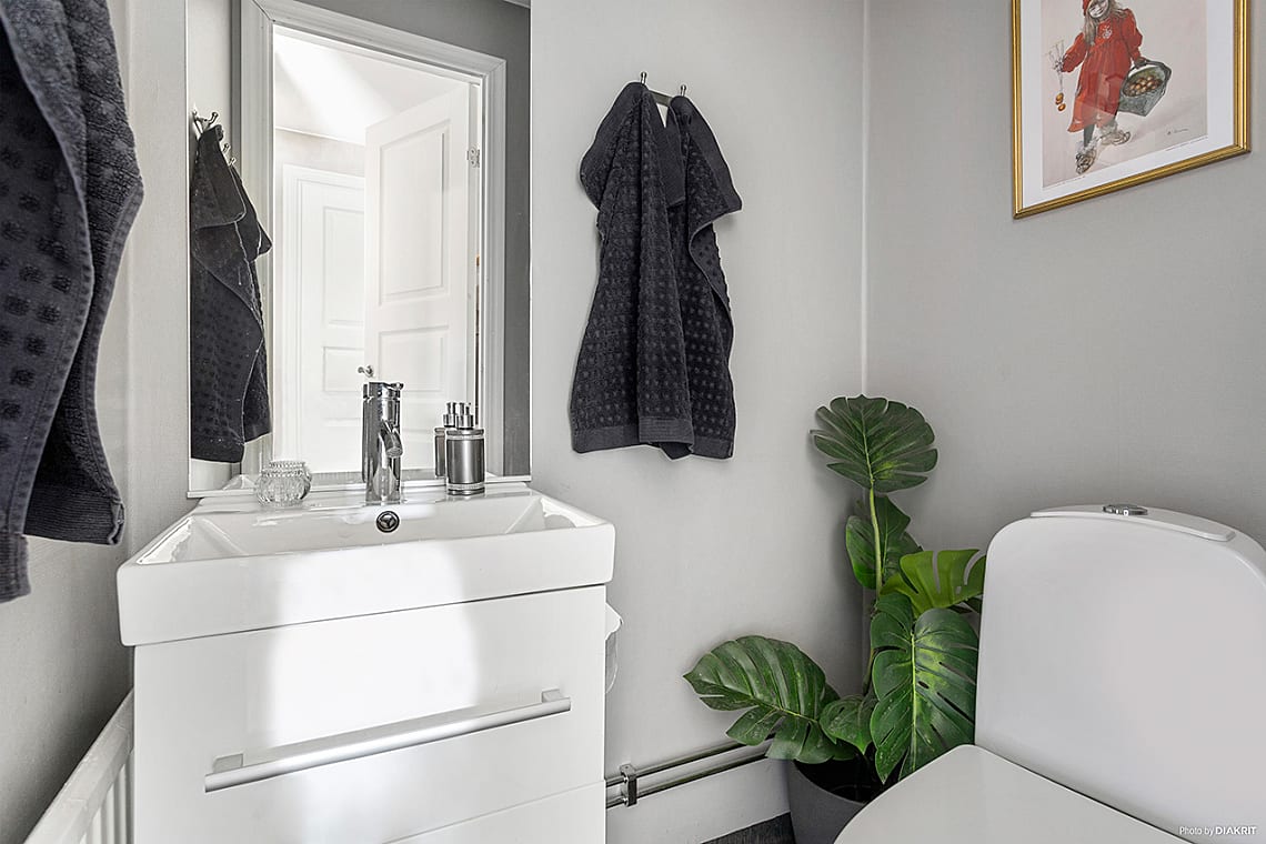 Intill hallen finns en gästtoalett med WC och handfat med kommod.