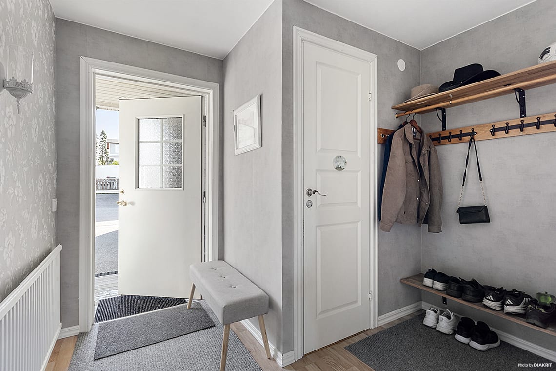 Ljus och välkomnande hall med klädhängare och skohylla.