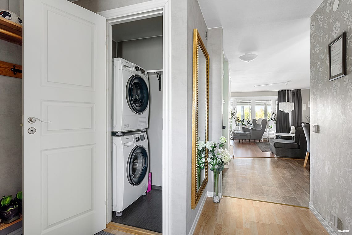 Från hallen når man även ett praktiskt tvättrum utrustat med tvättmaskin och torktumlare.