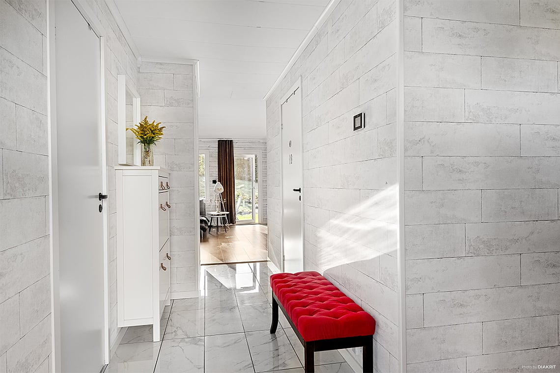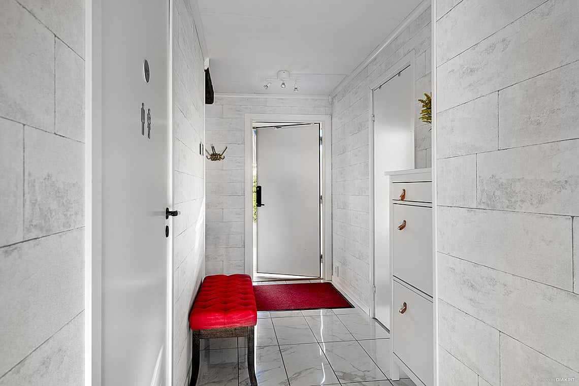 Välkomnande hall med plats för avhängning av ytterkläder och skor.