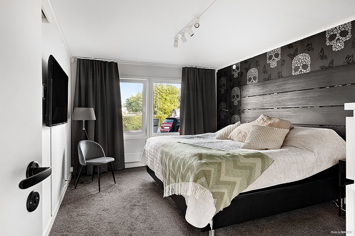 Rymligt sovrum med plats för dubbelsäng och tillhörande möbler.