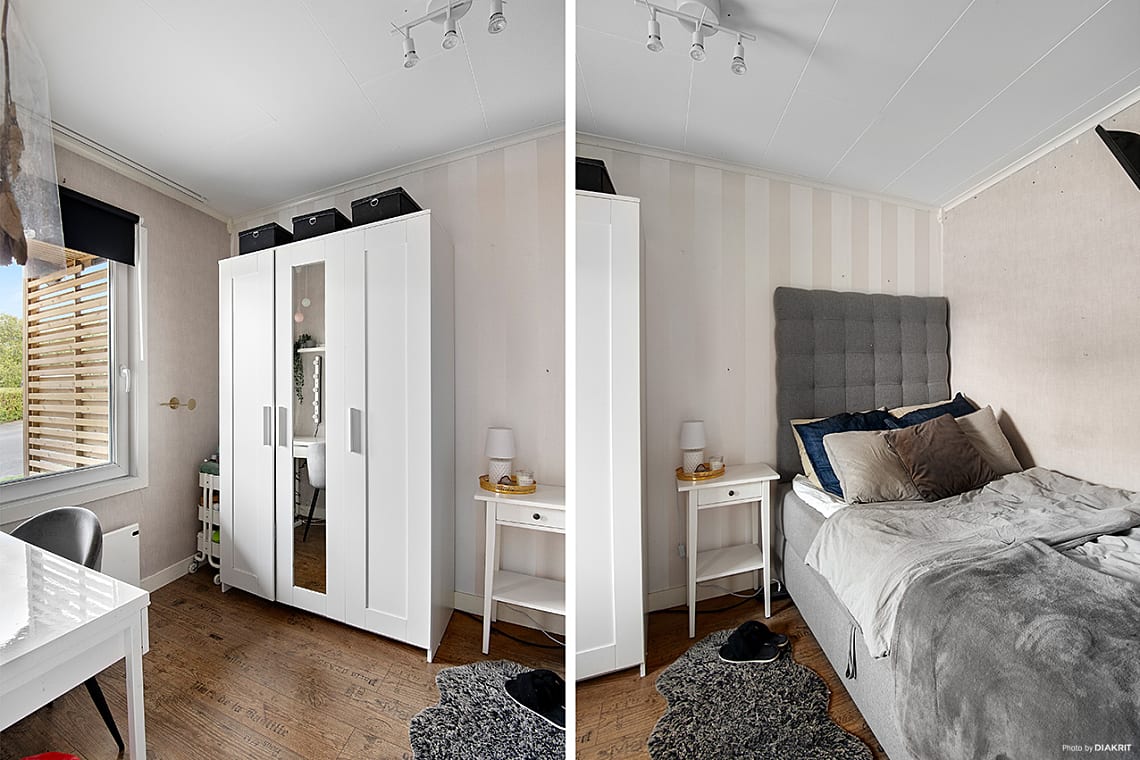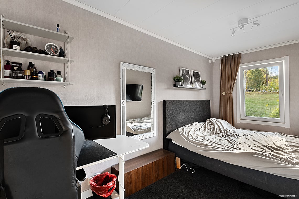 Rum av bra storlek som ger plats för säng och tillhörande sängbord samt skrivbord.