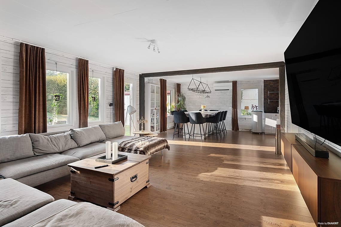 Ljust vardagsrum i öppen planlösning mot köket. Flera fönster ger rummet ett naturligt ljusinsläpp. Härifrån når du även bostadens soliga baksida.