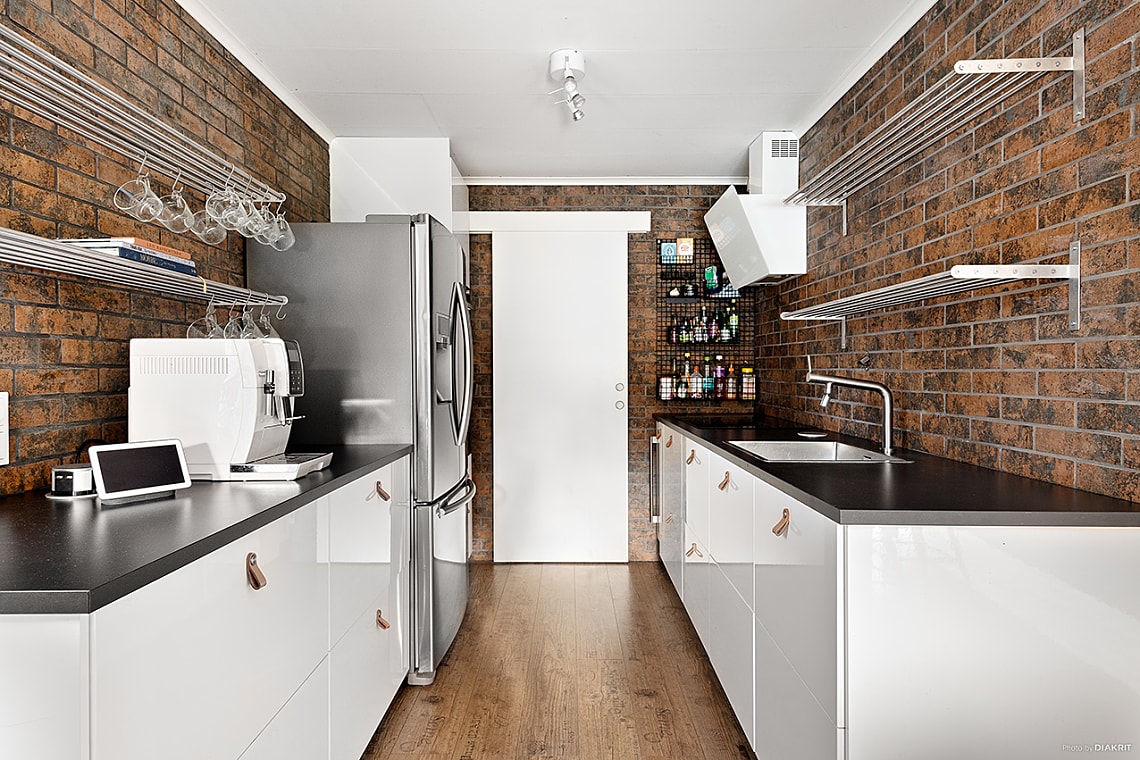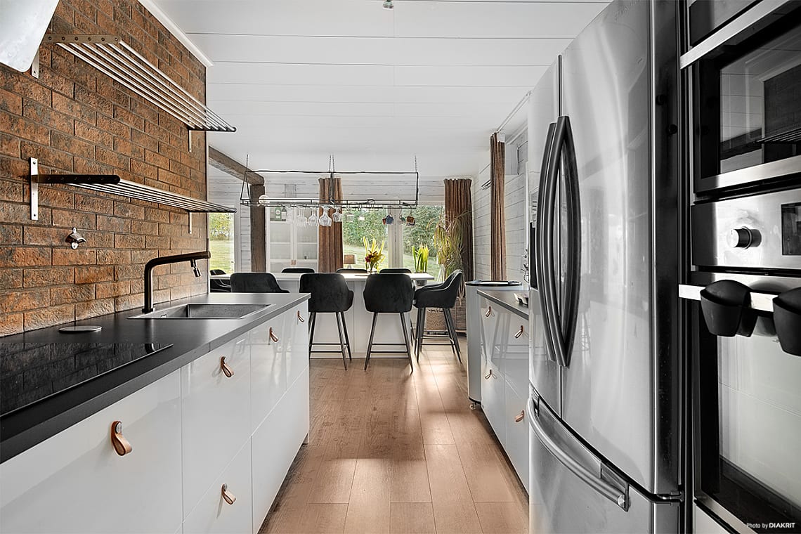 Stilfullt kök med förvaring bakom vita släta luckor och gott om arbetsyta. Köket är utrustat med inbyggnads ugn och mikro i bekväm arbetshöjd, kyl/frys, spishäll samt diskmaskin.