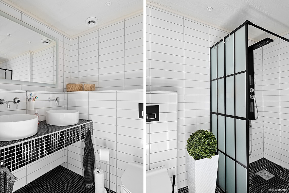 Stilfullt helkaklat badrum med vita väggar och svart klinkergolv.