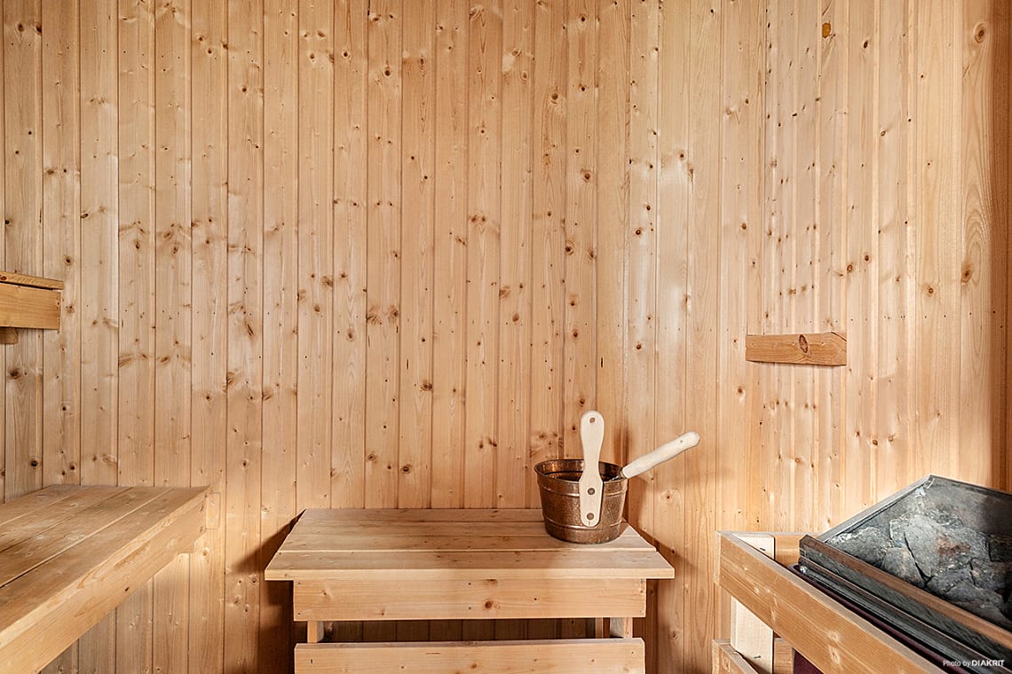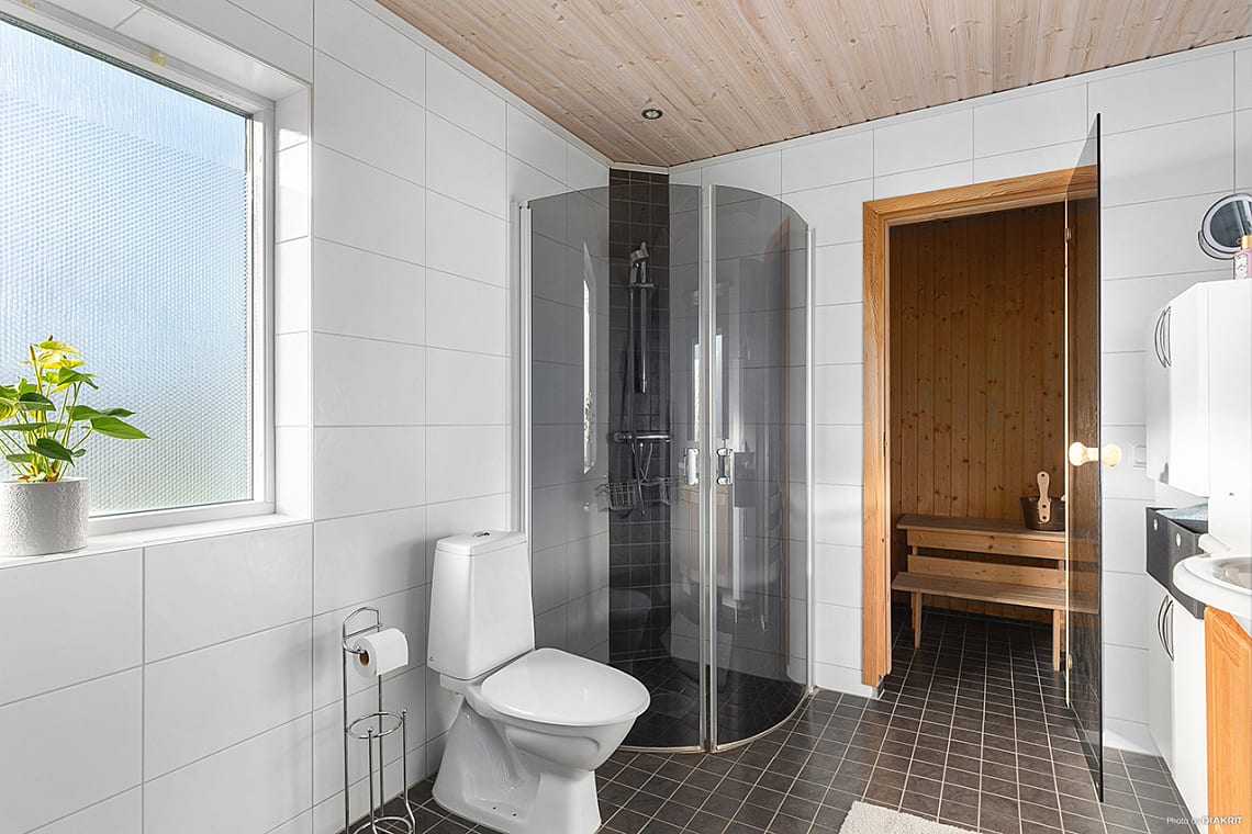 Helkaklat badrum med mörkare klinkersgolv. Här finns handfat i kommod, wc samt dusch med glasdörrar. Intill ligger bastun – en perfekt plats för avkoppling.