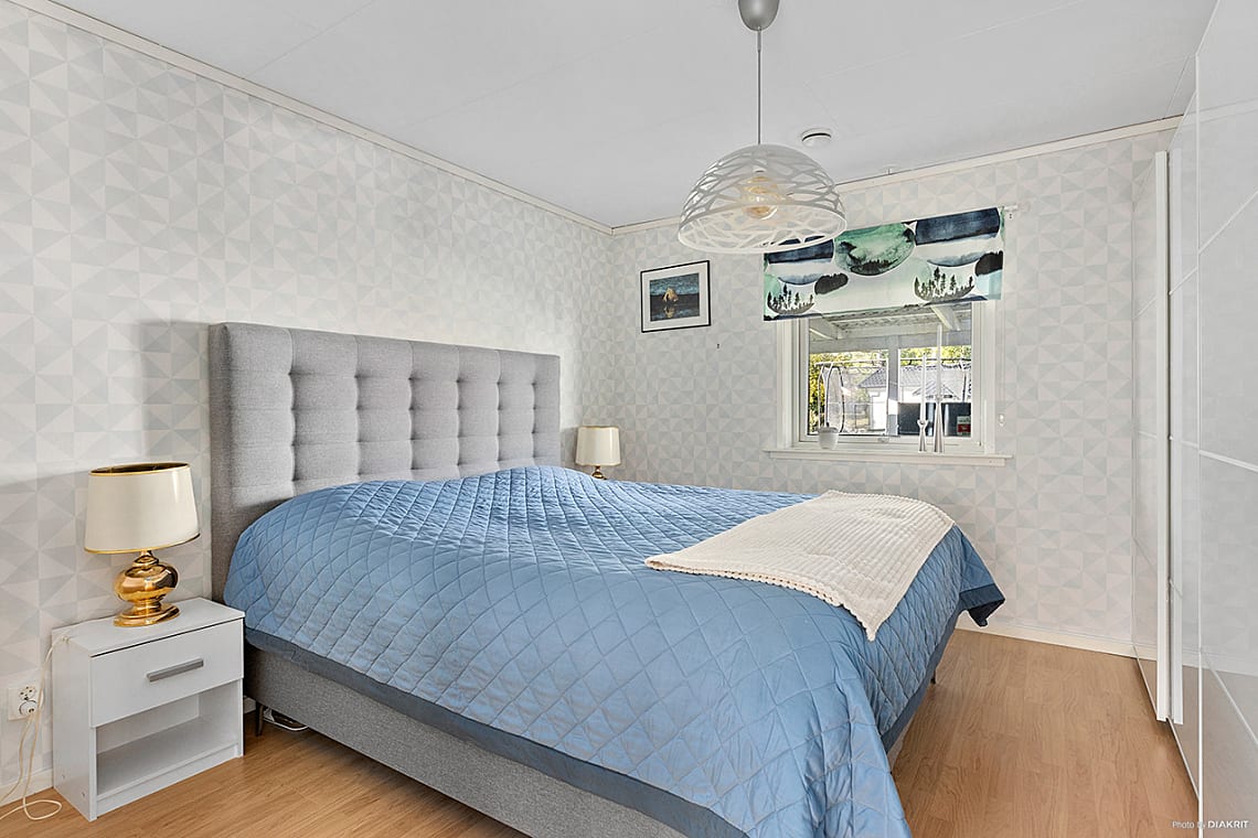 Rymligt sovrum med ljusa, mönstrade tapeter. Här finns gott om plats för dubbelsäng och tillhörande möbler.