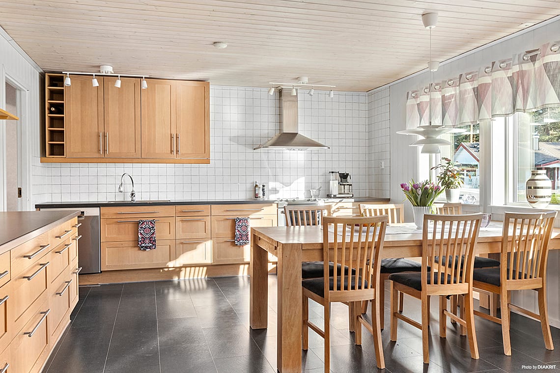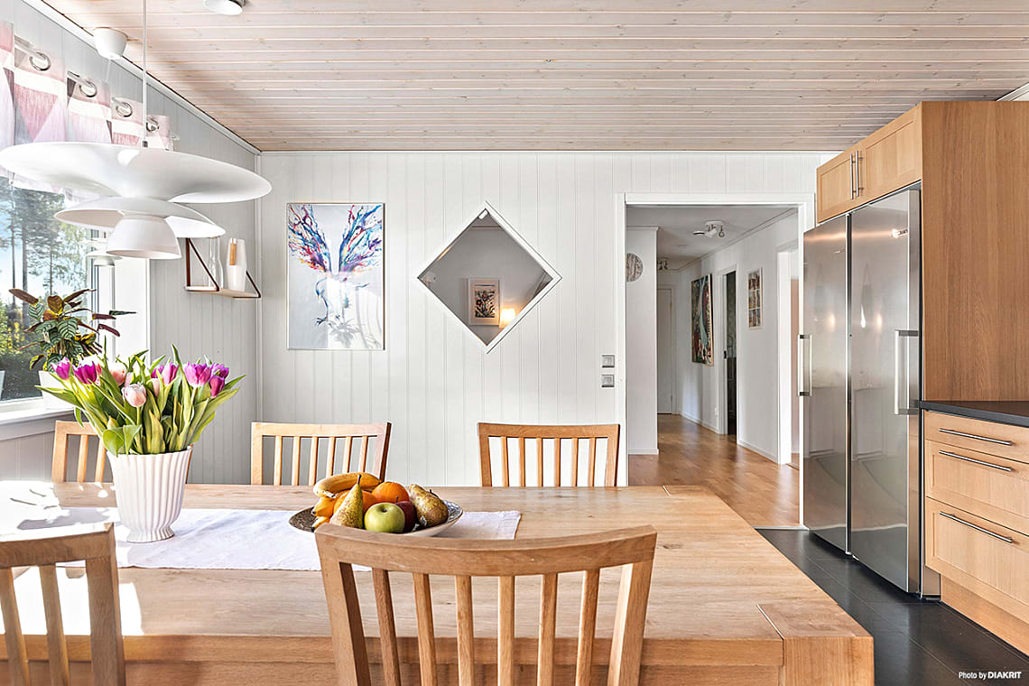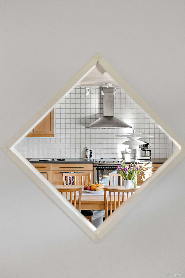 Praktiskt kök med gott om förvaring bakom släta spegelluckor. Här finns spis, ugn, fläkt, diskmaskin samt kyl och frys. Vid fönstret finns plats för matbord, perfekt för familjens måltider. Ljusmålad panelvägg.