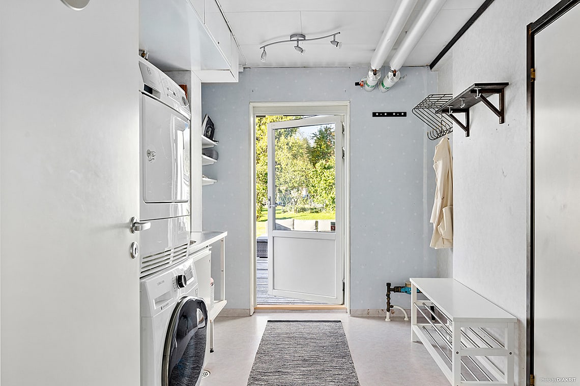Praktisk tvättstuga med ljusa väggar och utgång till uteplatsen. Här finns tvättmaskin och torktumlare.
