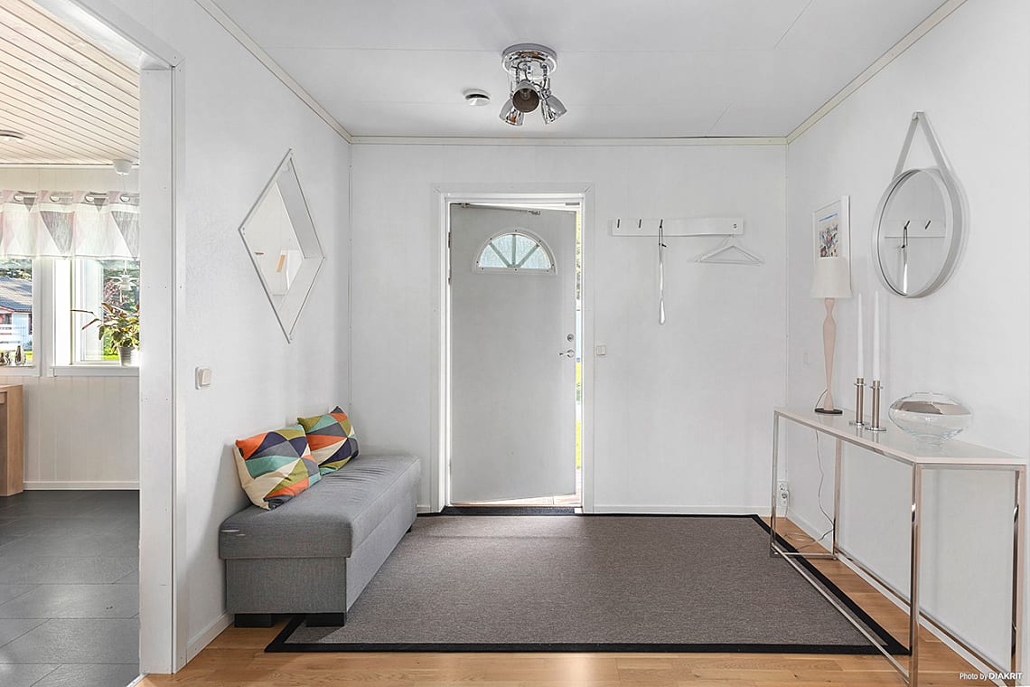 Välkomnande hall med plats för avhängning av kläder och skor. Ljusa väggar och parkettgolv ger ett ljust och inbjudande första intryck.