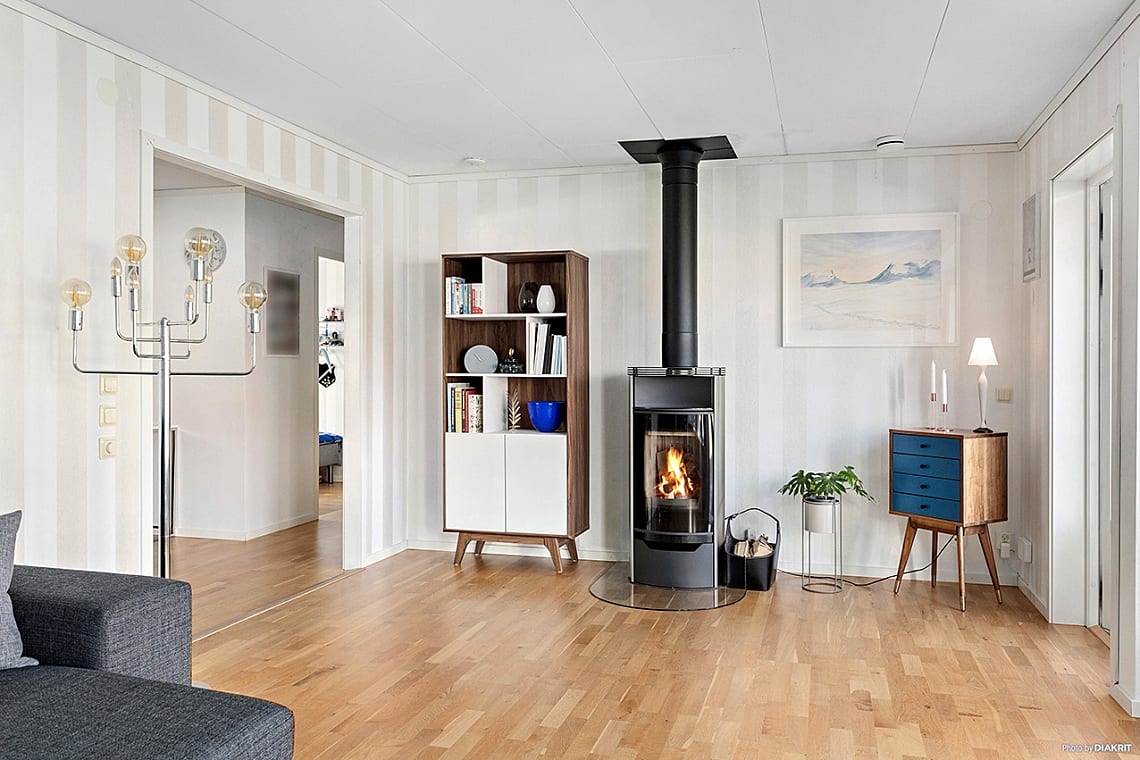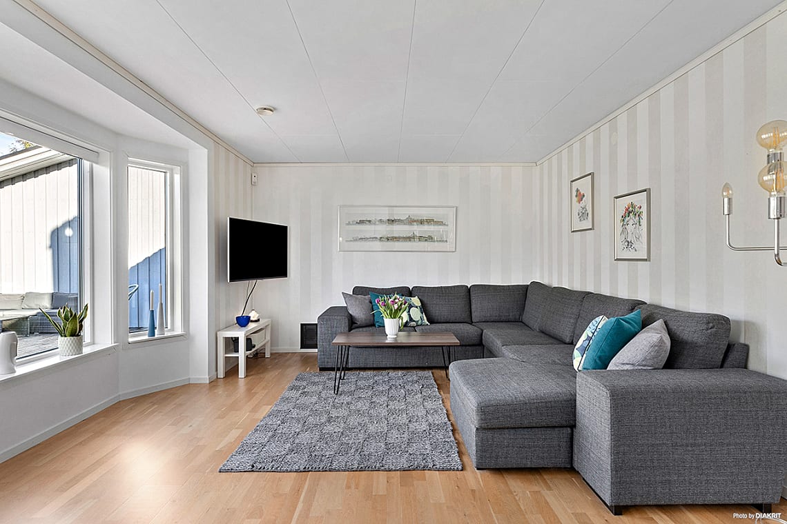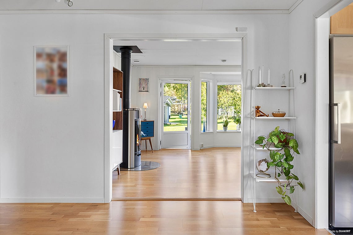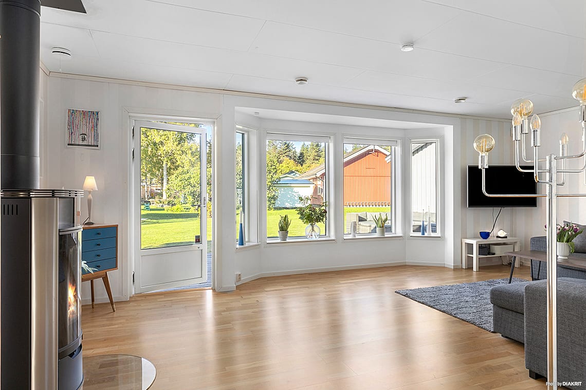 Generöst vardagsrum med plats för soffgrupp och möblemang. Här finns en värmande kamin och utgång till uteplatsen som förlänger rummet under årets varmare månader. Ljusa tapetserade väggar och parkettgolv.