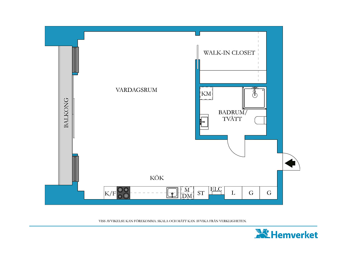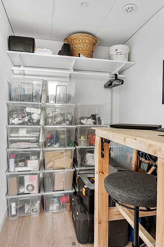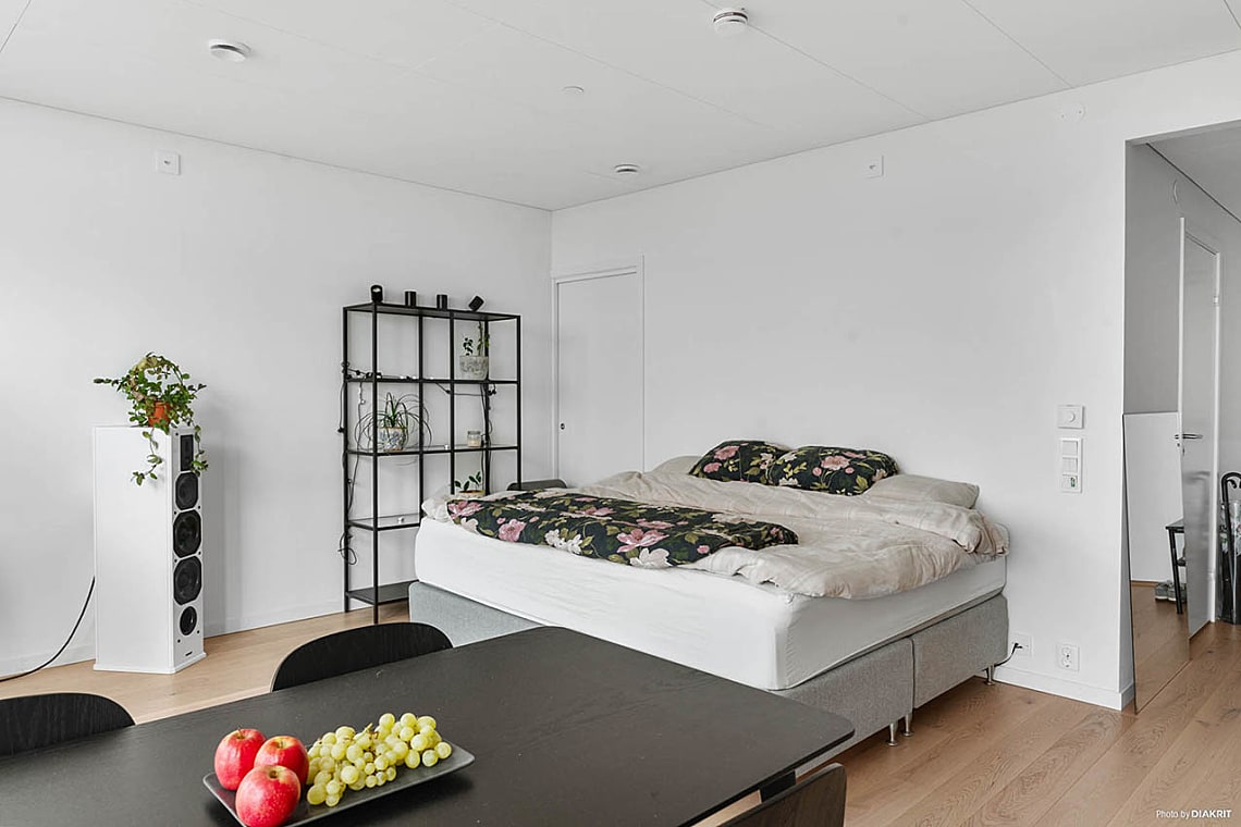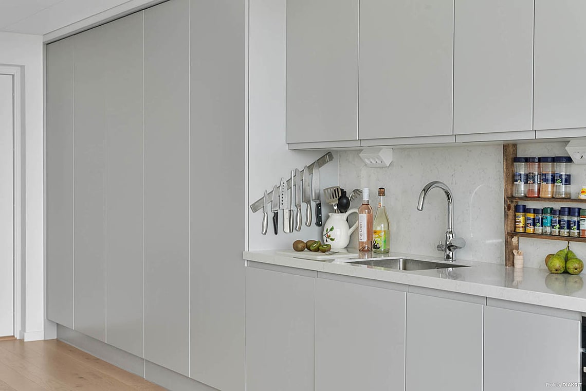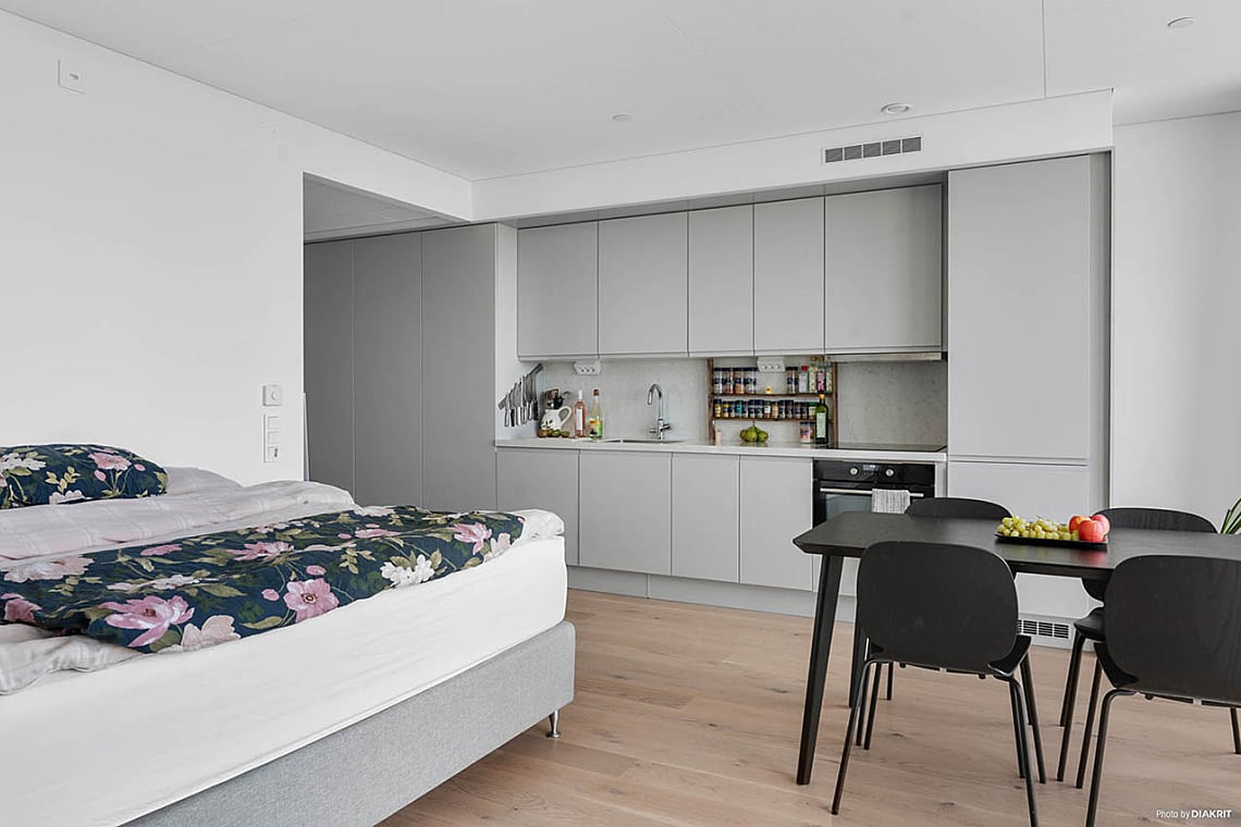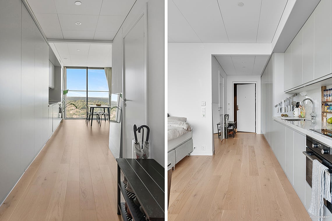 Ett ljust och inbjudande allrum där funktion möter stil. Här finns genomtänkta flöden, integrerade maskiner och hållbara materialval. De släta luckorna med grepplister är målade i en varmgrå ton, särskilt framtagen för Karlatornet, och skapar en elegant helhet. Rummet rymmer både soffa, säng och matplats, och är lätt att möblera efter behov och smak. Härifrån når du dessutom en rymlig walk-in-closet/förråd, perfekt för extra förvaring.