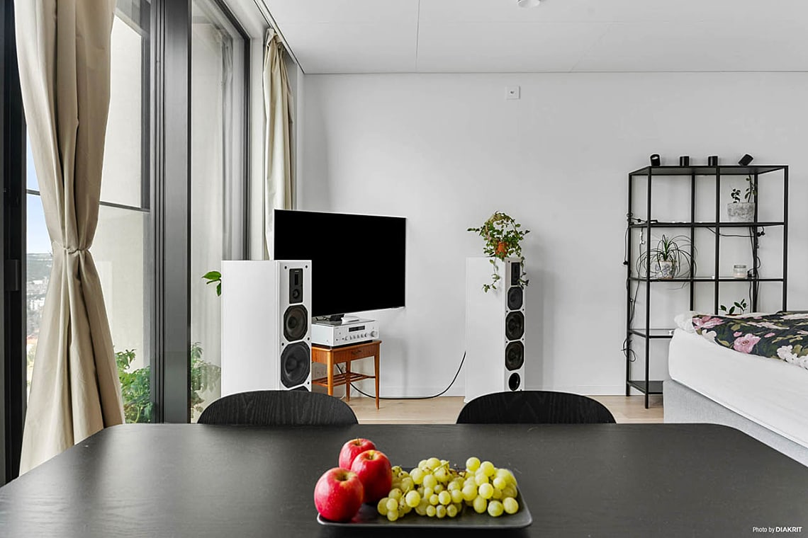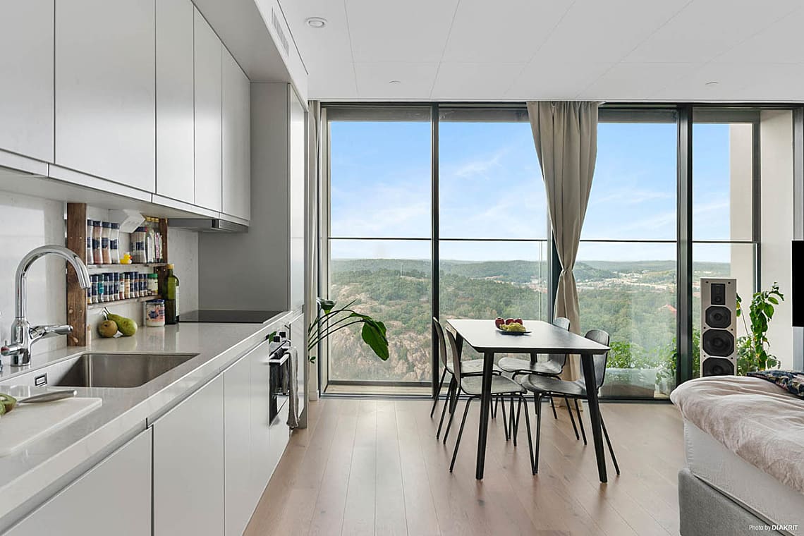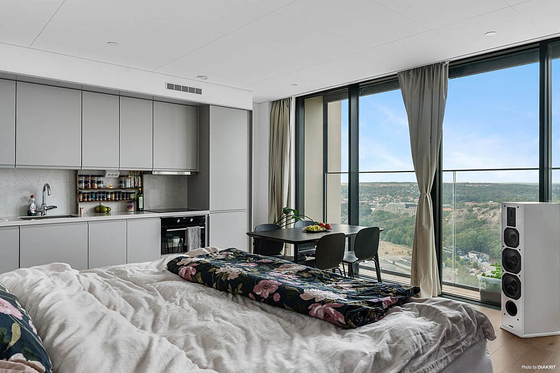 Lägenheten är genomtänkt planerad med fönster från golv till tak som släpper in rikligt med dagsljus och förstärker känslan av rymd. Från vardagsrummet når du en härlig balkong där kvällssolen och stadens glittrande ljus blir en naturlig del av din vardag. Den öppna planlösningen skapar generösa sociala ytor, perfekta för middagar, umgänge och avkoppling med en utsikt som ständigt förändras.