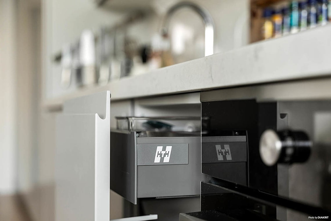 Köket från HTH är stilfullt och funktionellt, utrustat med integrerade vitvaror och en exklusiv bänkskiva. Badrummet är lika elegant, klätt i granitkeramik med moderna lösningar och en praktisk kombimaskin. Allt i lägenheten präglas av noga utvalda material och en tidlös design.
