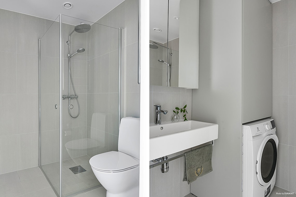 I Karlatornet är badrummen utformade med hög kvalitet och stor omsorg om detaljerna. Här möts du av ljus granitkeramik på både väggar och golv, stilrena kromdetaljer och en rymlig spegel som förstärker känslan av rymd. Bakom glasdörrar finns dusch med takdusch för extra komfort. Badrummet är dessutom utrustat med wc, handfat, spegelskåp samt en smart platsbyggd förvaringsmöbel i samma kulör som köksluckorna, där en praktisk kombimaskin är integrerad.