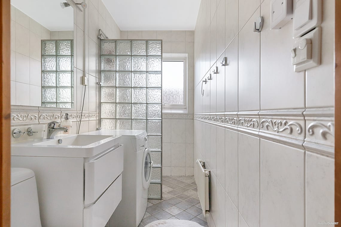 Stilrent, helkaklat badrum med golvvärme och ljusa ytor. Här finns handfat i kommod, tvättmaskin, WC och dusch bakom glasvägg – ett fräscht och funktionellt utrymme.