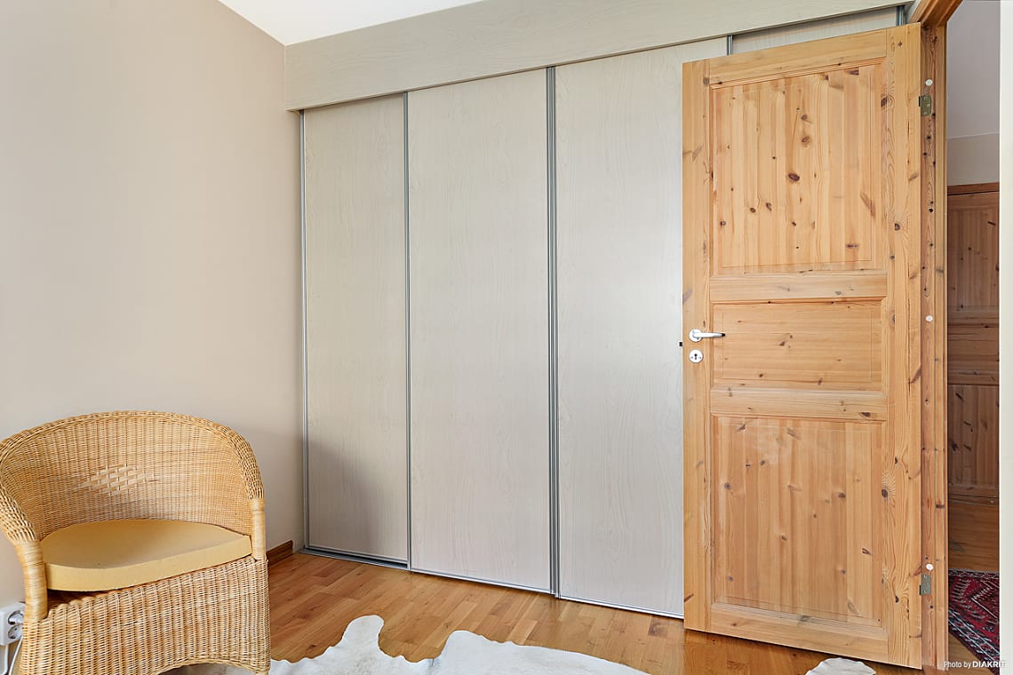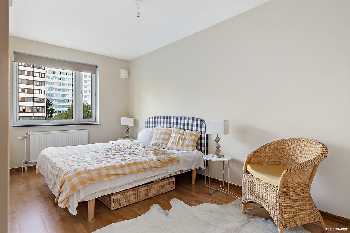 Ljust och rymligt sovrum med plats för dubbelsäng och tillhörande möbler. Garderober erbjuder praktisk förvaring.
