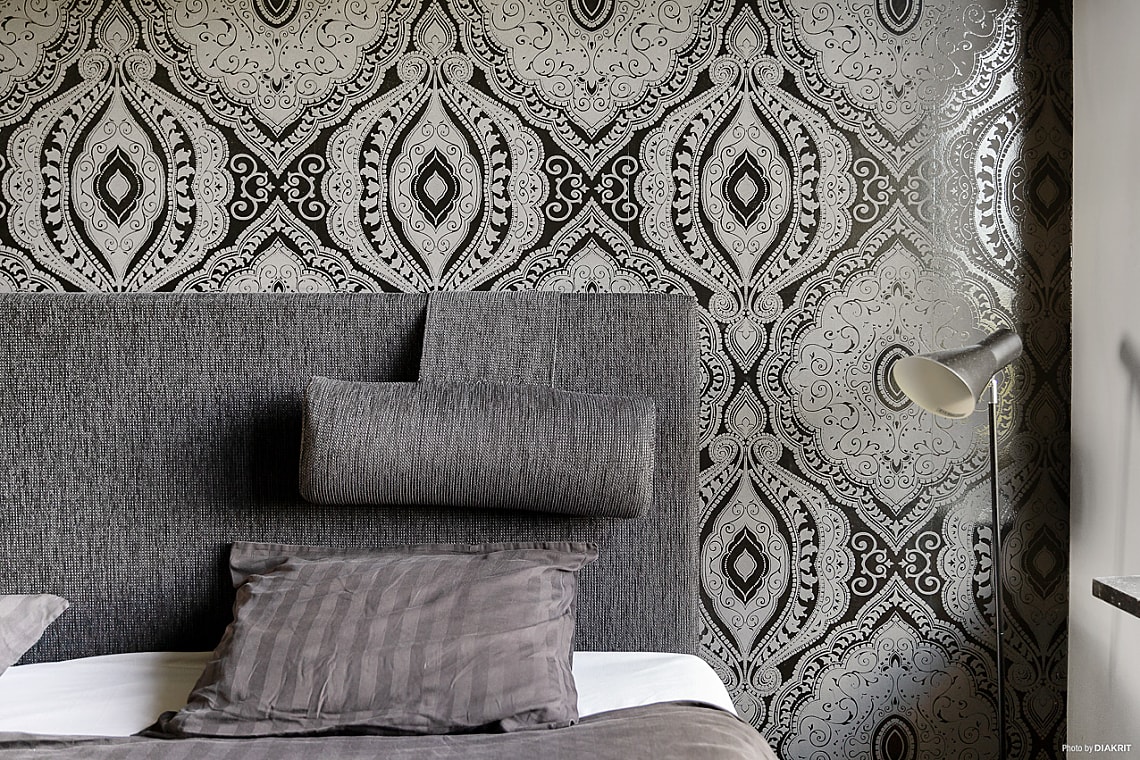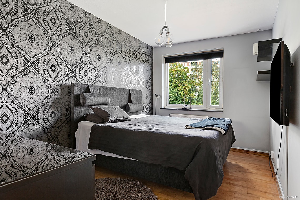 Generöst sovrum med mönstrad fondvägg och parkettgolv. Plats för säng och övriga möbler, ett rofyllt rum att varva ner i.