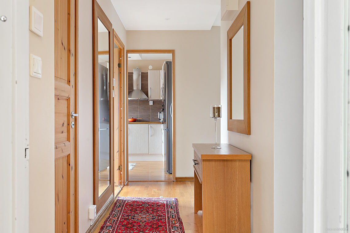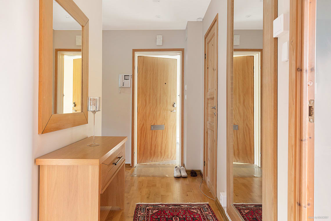 Välkomnande hall med goda avhängningsmöjligheter för kläder och skor. Parkettgolv som leder vidare in i bostaden.