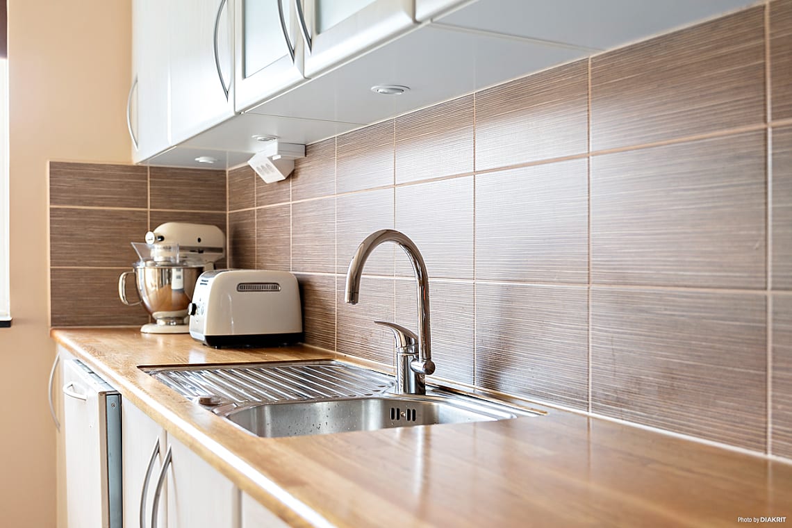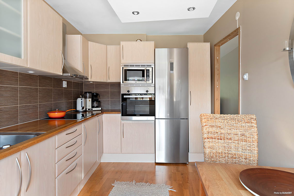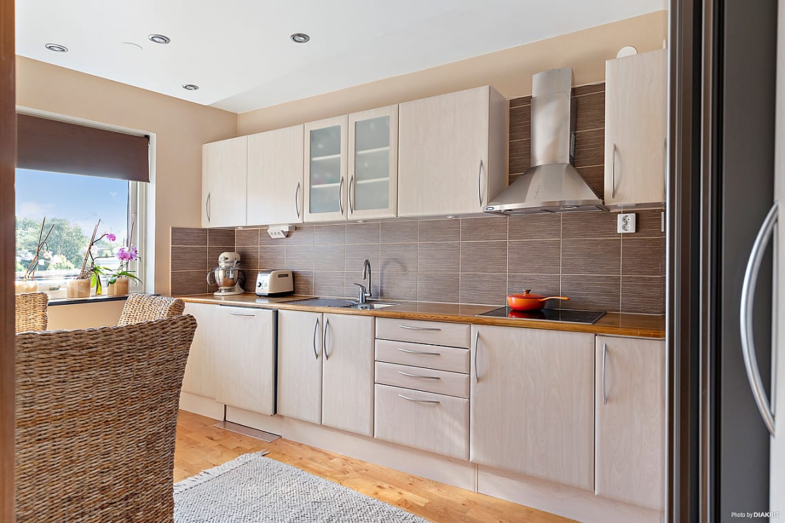Ljust och funktionellt kök med gott om förvaring bakom ljusa skåpsluckor. Kakel i varm brun nyans på stänkskyddet. Utrustningen består av spis med fläkt, inbyggd ugn och mikro, diskmaskin samt kyl/frys – perfekt för matlagning och sociala stunder.