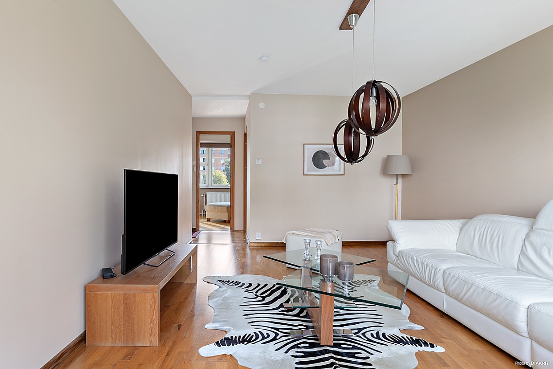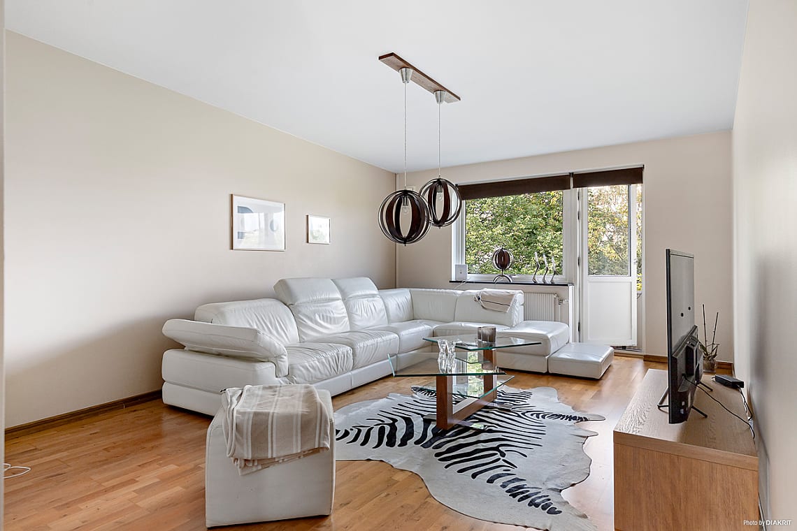 Rymligt vardagsrum med ljusa väggar och parkettgolv. Här finns plats för både soffgrupp och övriga möbler samt utgång till balkongen, som ger ett härligt ljusinsläpp.