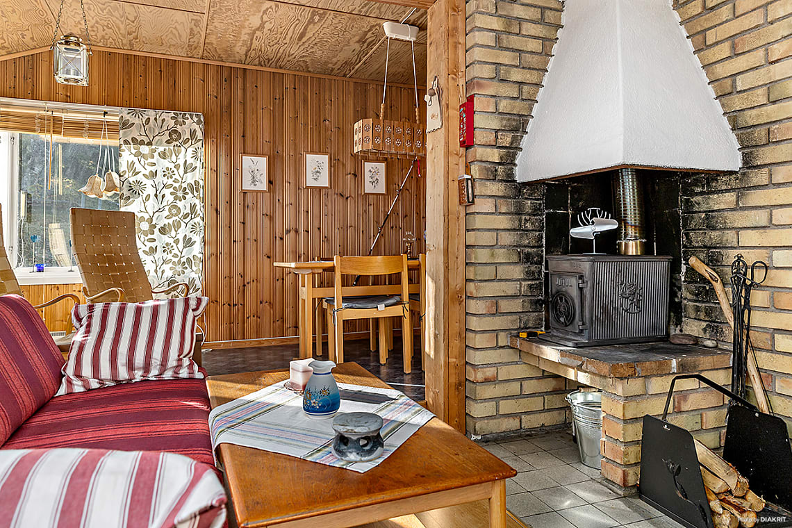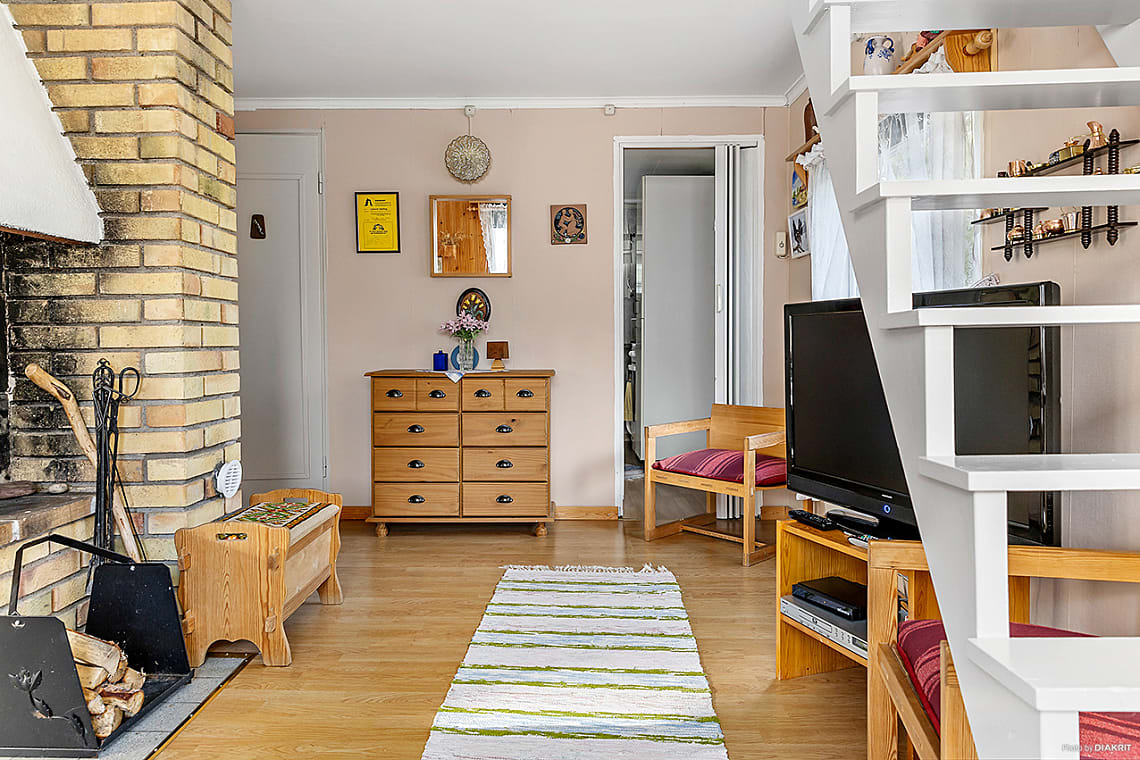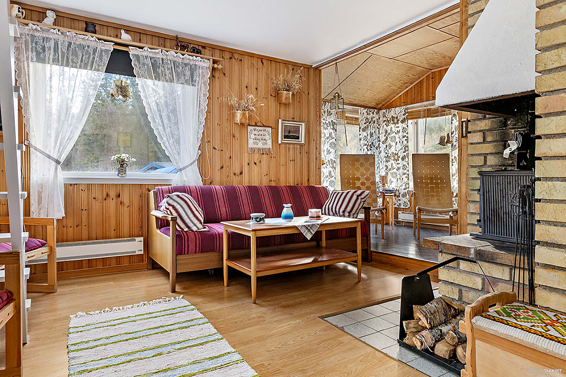 Ljust allrum med plats för soffa och tillhörande möbler. Här finns en öppen spis.