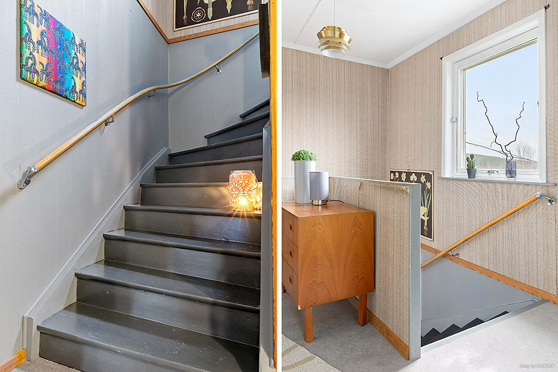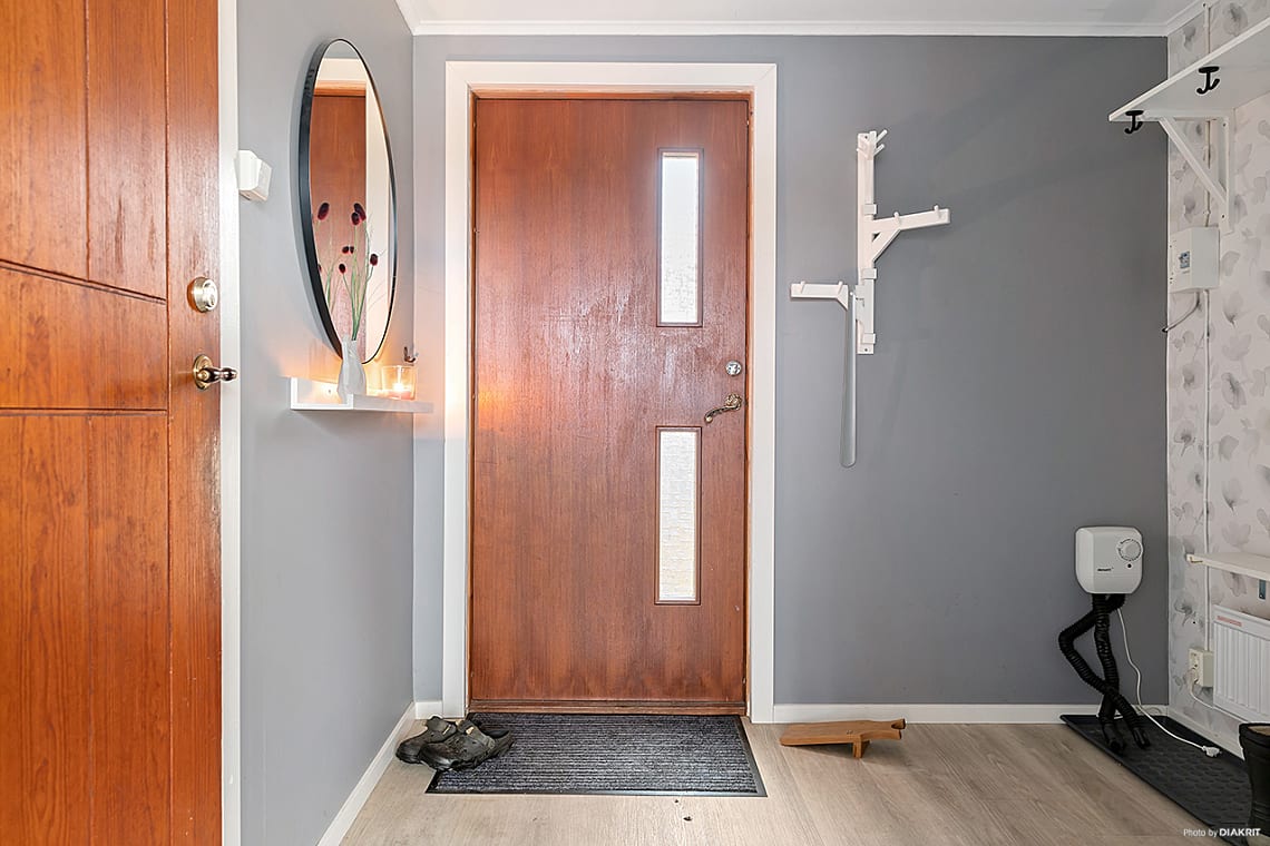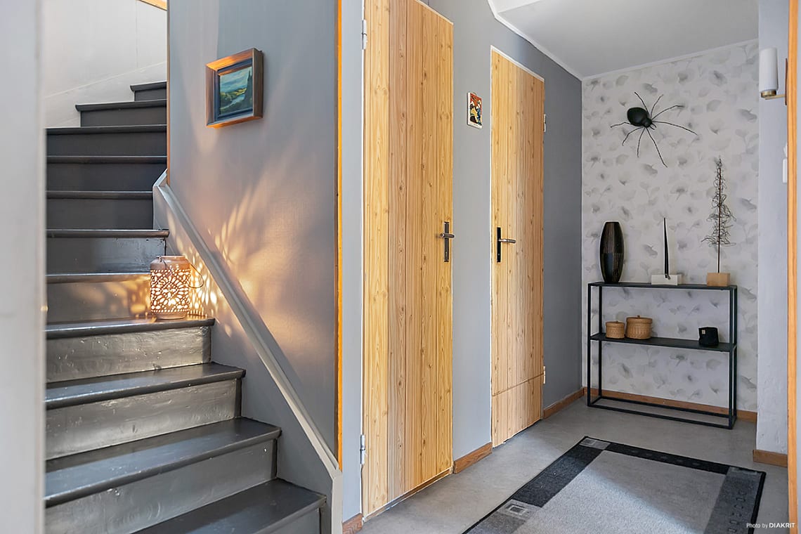 Välkomnande hall med plats för avhängning av ytterkläder och skor. Intre hall med trappa upp till övre plan samt ner till källarplan.