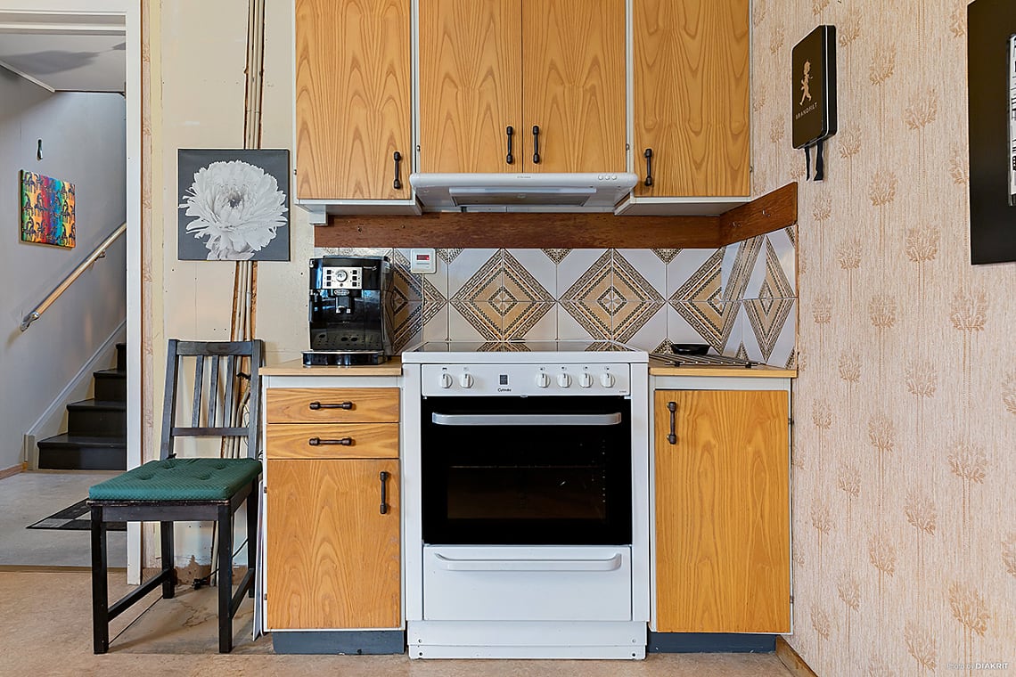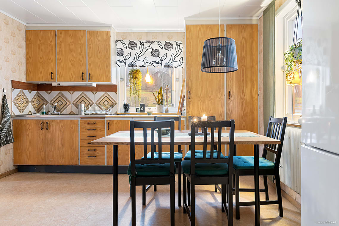 Bra arbetskök med goda förvaringsmöjligheter och gott om arbetsyta. Plats för matbord intill fönster.