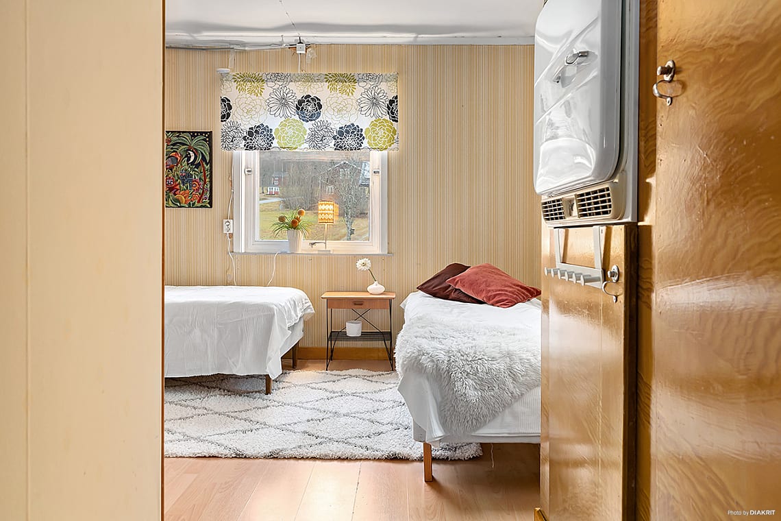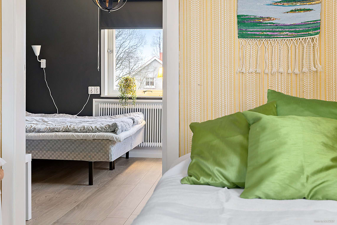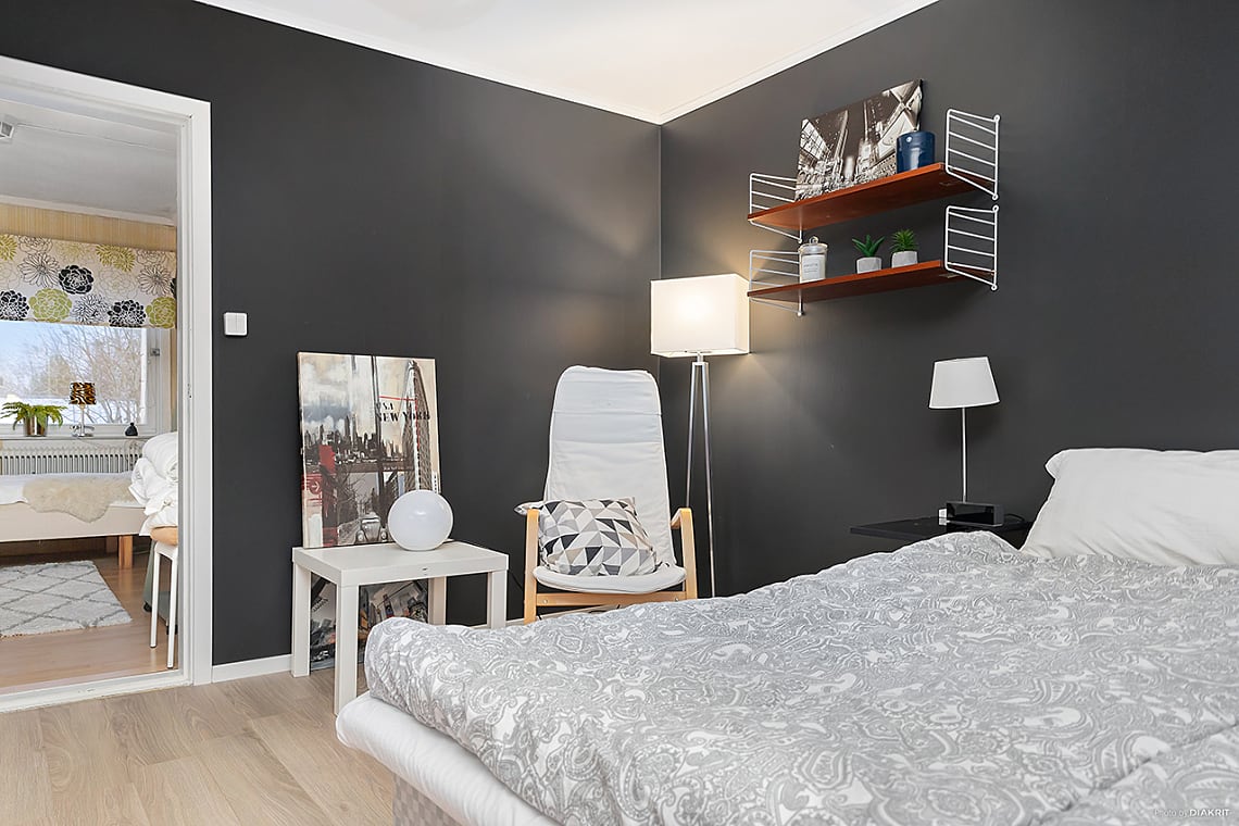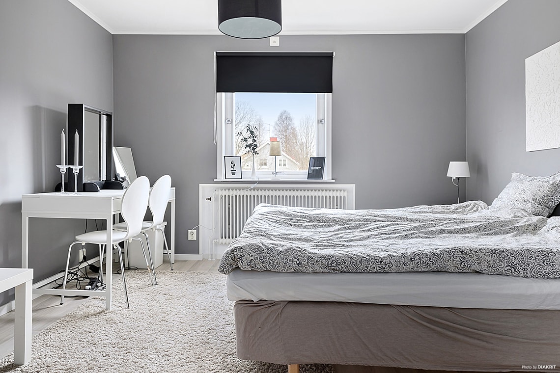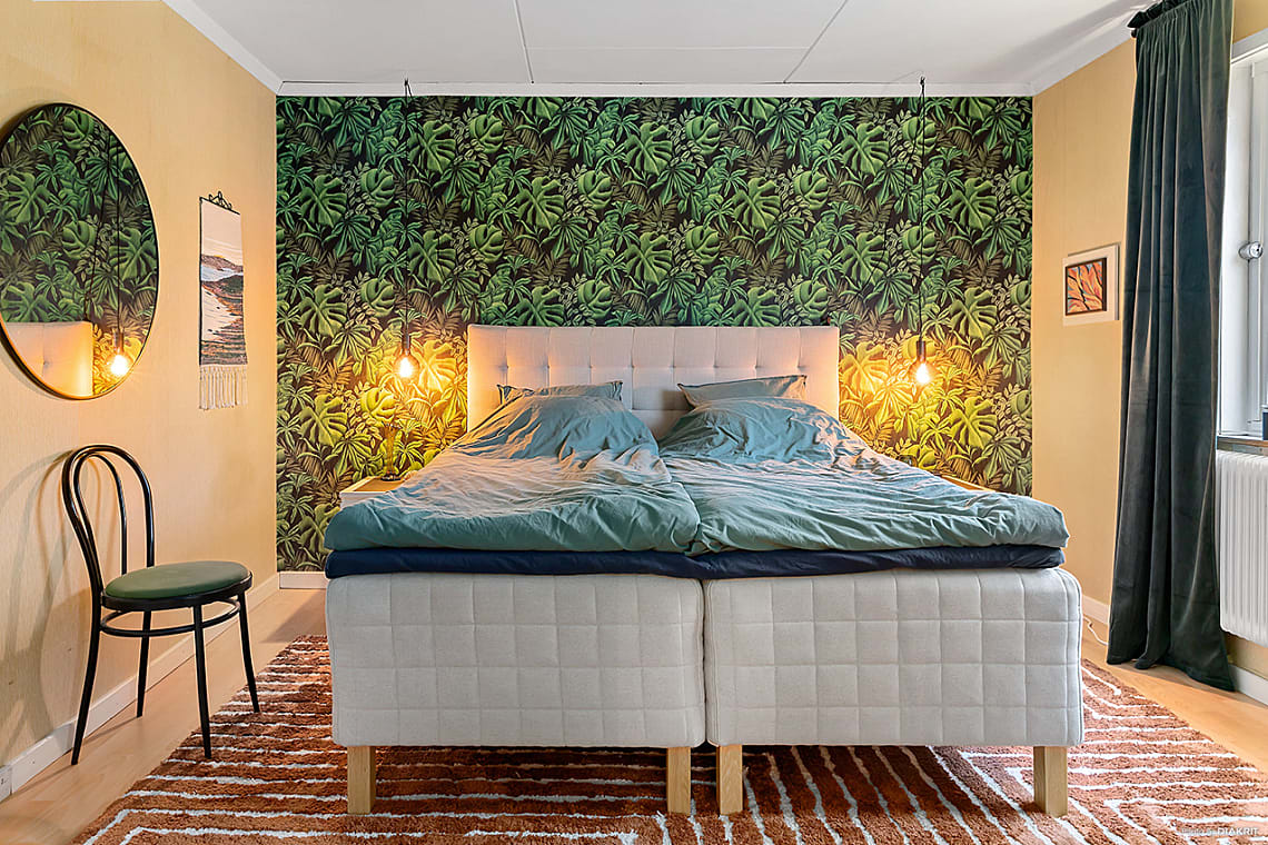 Här finns plats för dubbelsäng med tillhörande sängbord och förvaringsmöbel.