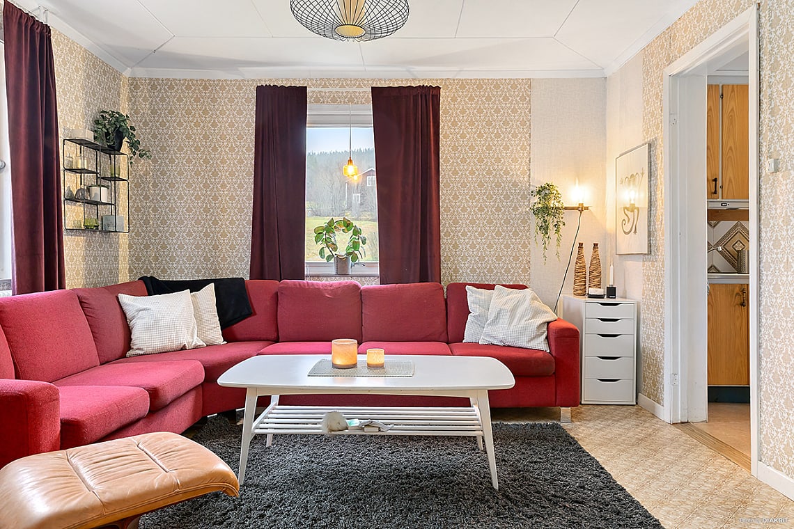 Ljust vardagsrum med ljusinsläpp från två håll. Rummets rymd ger plats för soffgrupp med tillhörande möbler.