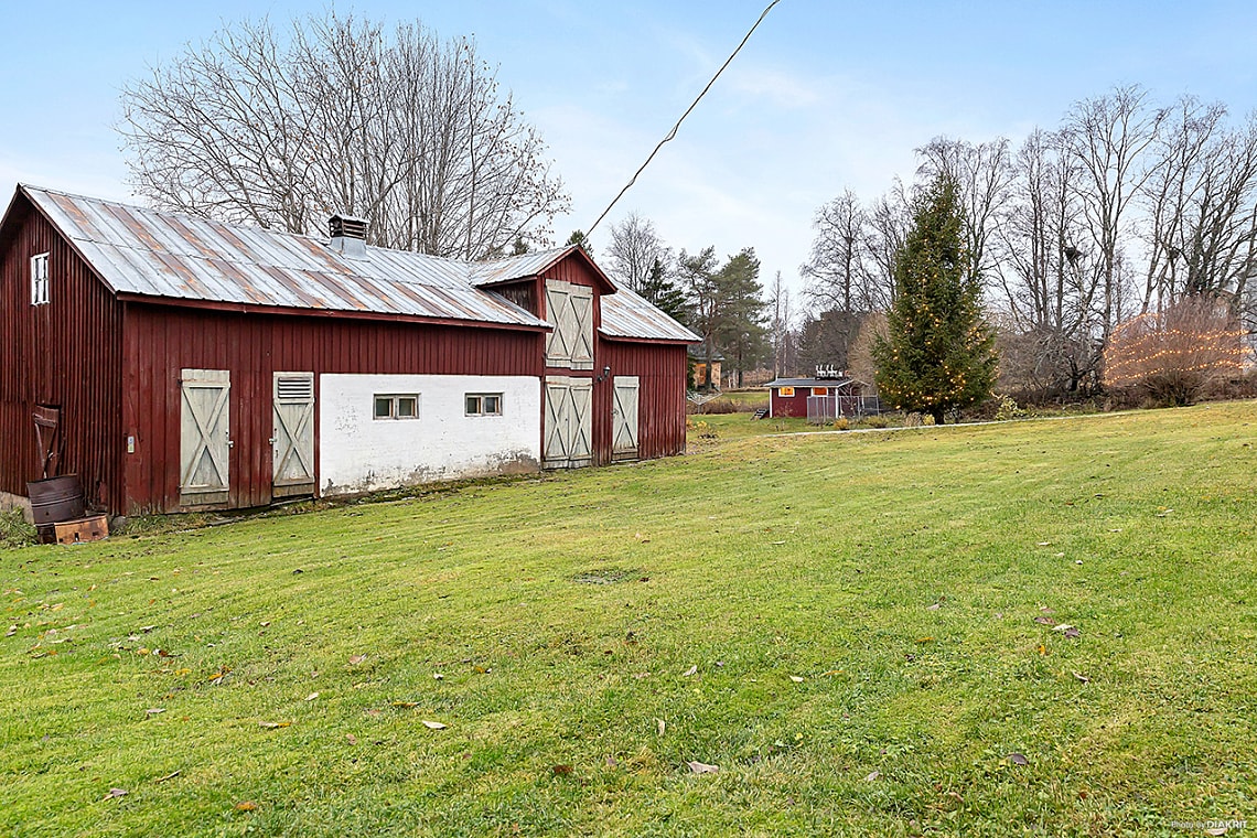 Byggnaden inrymmer bland annat en ladugårdsdel, ett mindre garage som lämpar sig väl för trädgårdsredskap eller mindre fordon, samt ett praktiskt loft som ger extra förvaring. Här finns gott om potential för dig som vill kombinera boende med hobby eller mindre verksamhet.