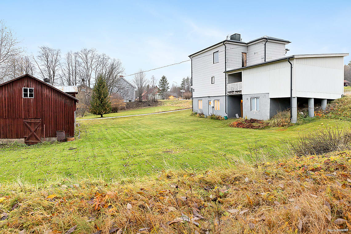 På tomten står en stor ekonomibyggnad med många användningsområden, här finns plats för verkstad, hobbyverksamhet, djurhållning eller annan förvaring. Trädgården är välskött med gröna ytor, bärbuskar och rabarber, vilket ger både trivsel och nytta.